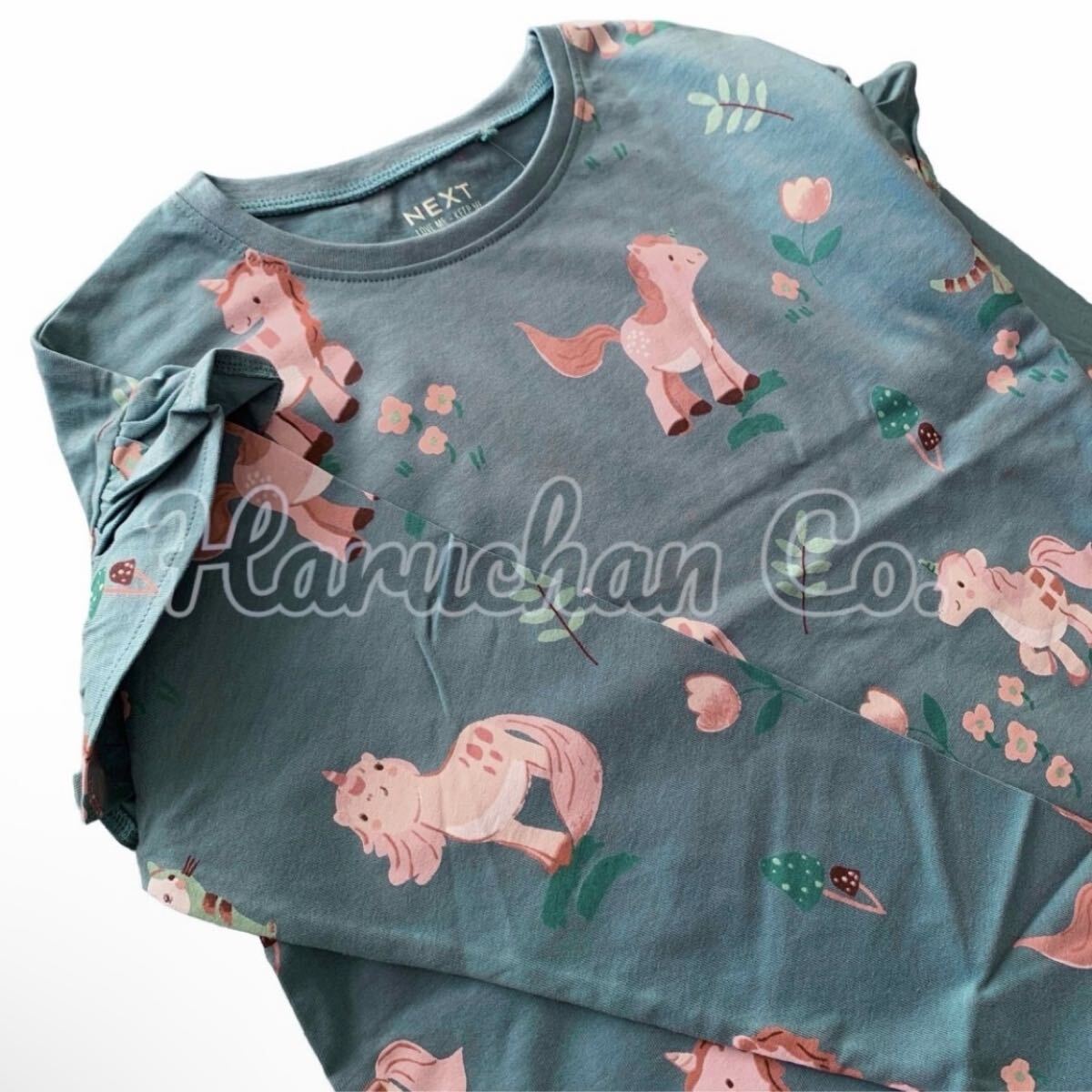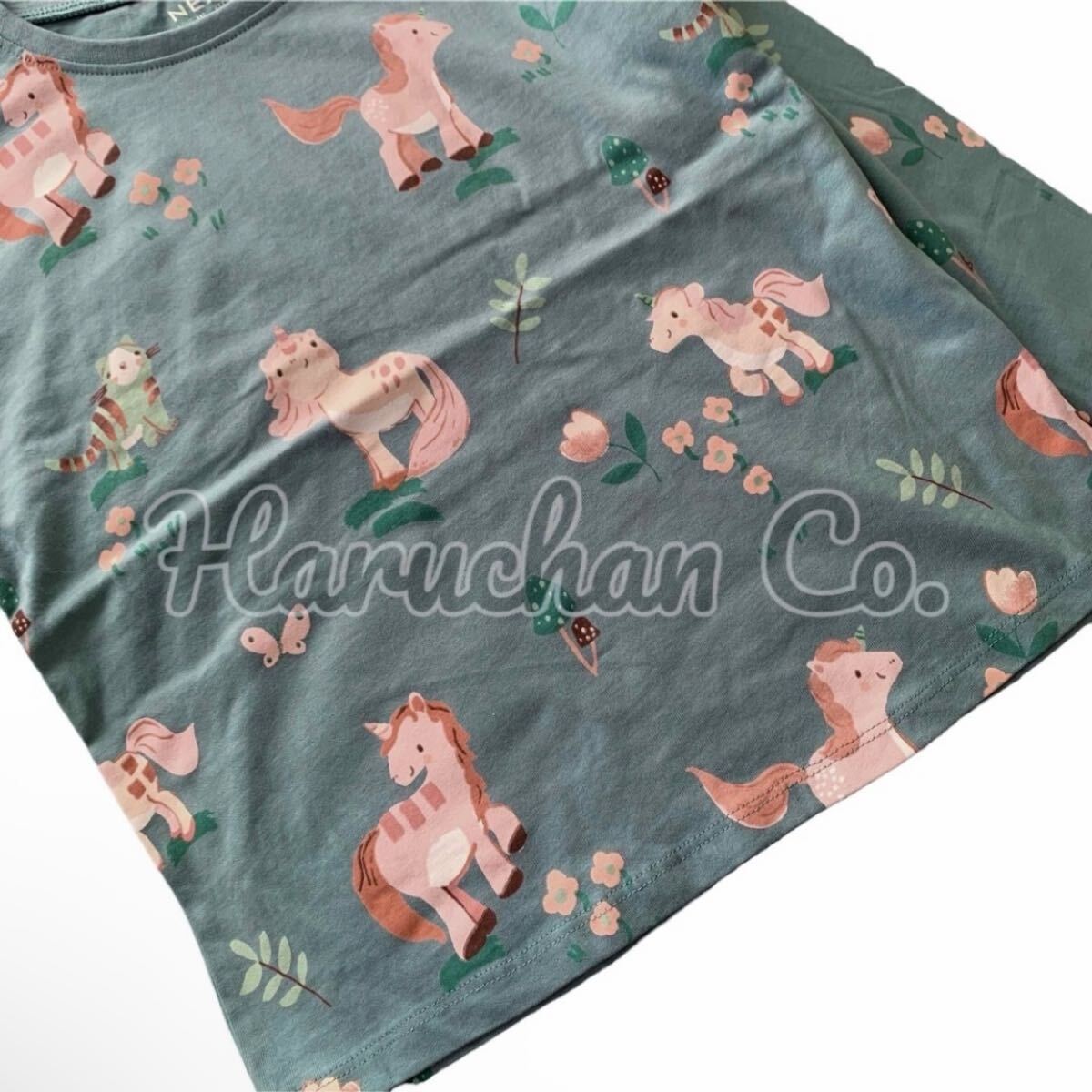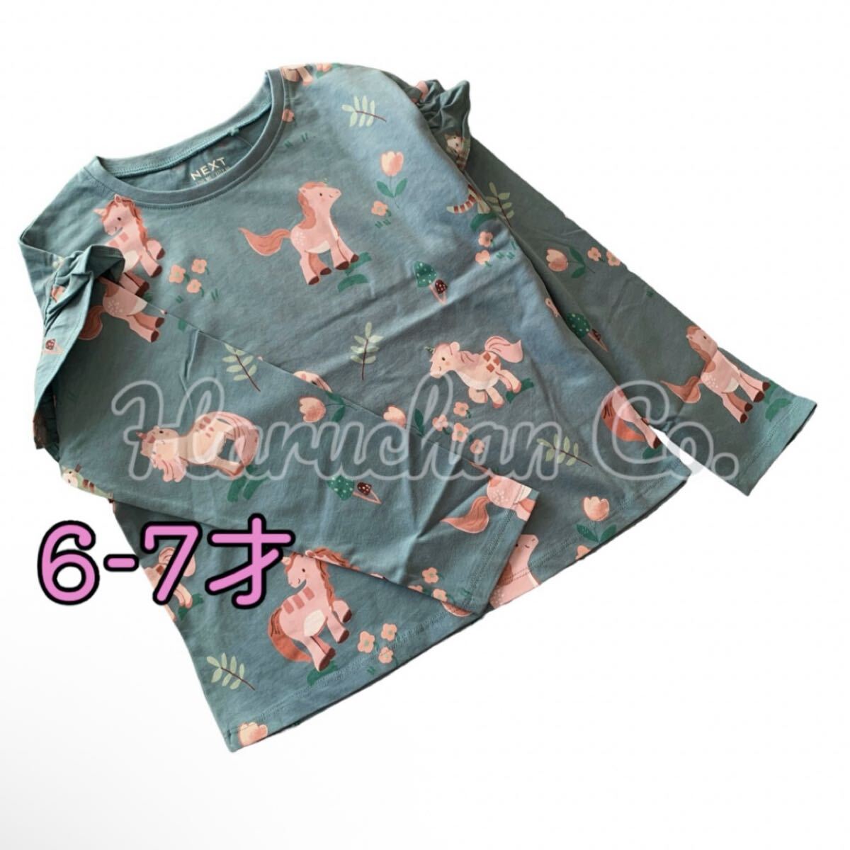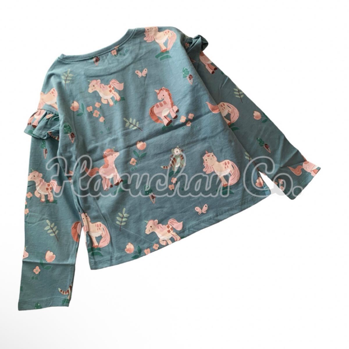 深いくすみ系のグリーンに、アニメの様なユニコーンと花柄がかわいい肩フリルのロンT