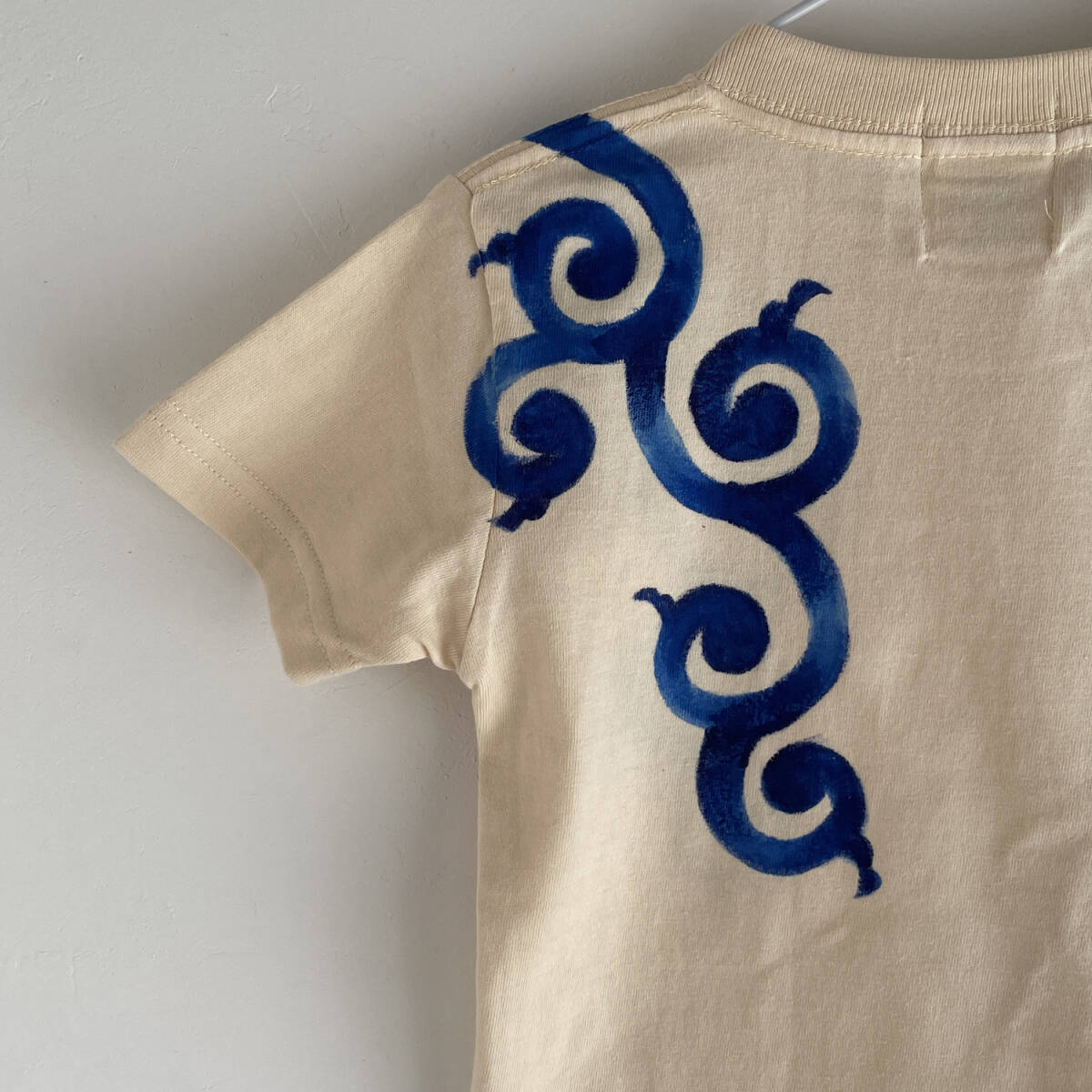 ご覧いただきありがとうございます。 一つ一つ丁寧に手描きで絵付けし、筆跡やカスレなどがプリントTシャツとは一味ちがう手描きならではの味わいとなっております。 フロント左肩からバックの左肩にかけてつながるようにブルーで唐草の柄を大胆に描いています。 藍染のような濃い青色が和風でシックなデザインの個性的なTシャツです。 誕生日プレゼント、お祝いにおススメです。 カラー:ナチュラル サイズ:130 130:身丈51㎝ 身幅37㎝ 肩幅34㎝ 袖丈15㎝ ※ 90サイズには方部分に樹脂製のスナップボタンがつきます、それ以外のサイズにはボタンはつきません。 素材:綿100% Tシャツ素材について:5.6オンス 胴仕上げ 首リブはダブルステッチ しっかりふっくらとした生地のハイクオリティなTシャツ、繰り返しの洗濯にもよれないコシのあるリブはTシャツ好きさんには納得していただける素材のTシャツを使用しております。 | |||