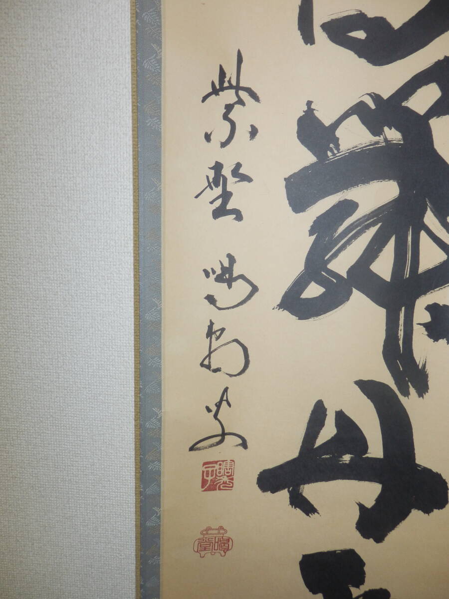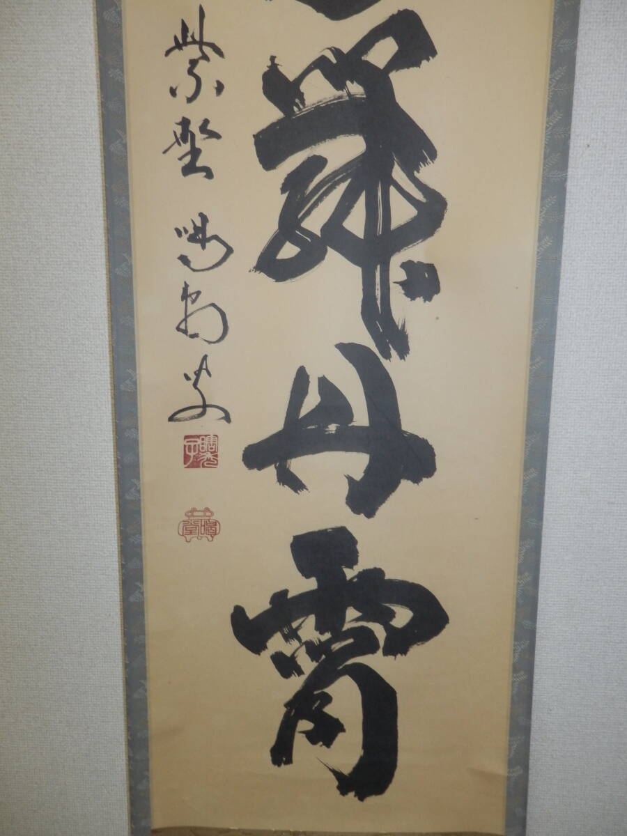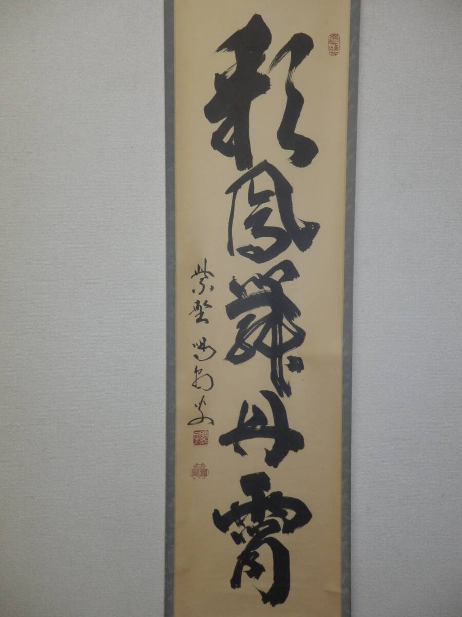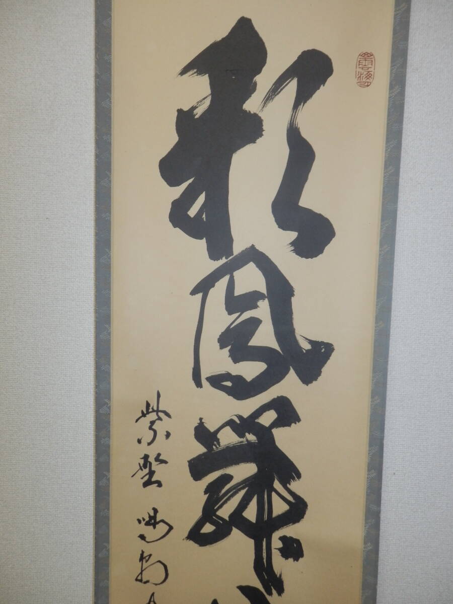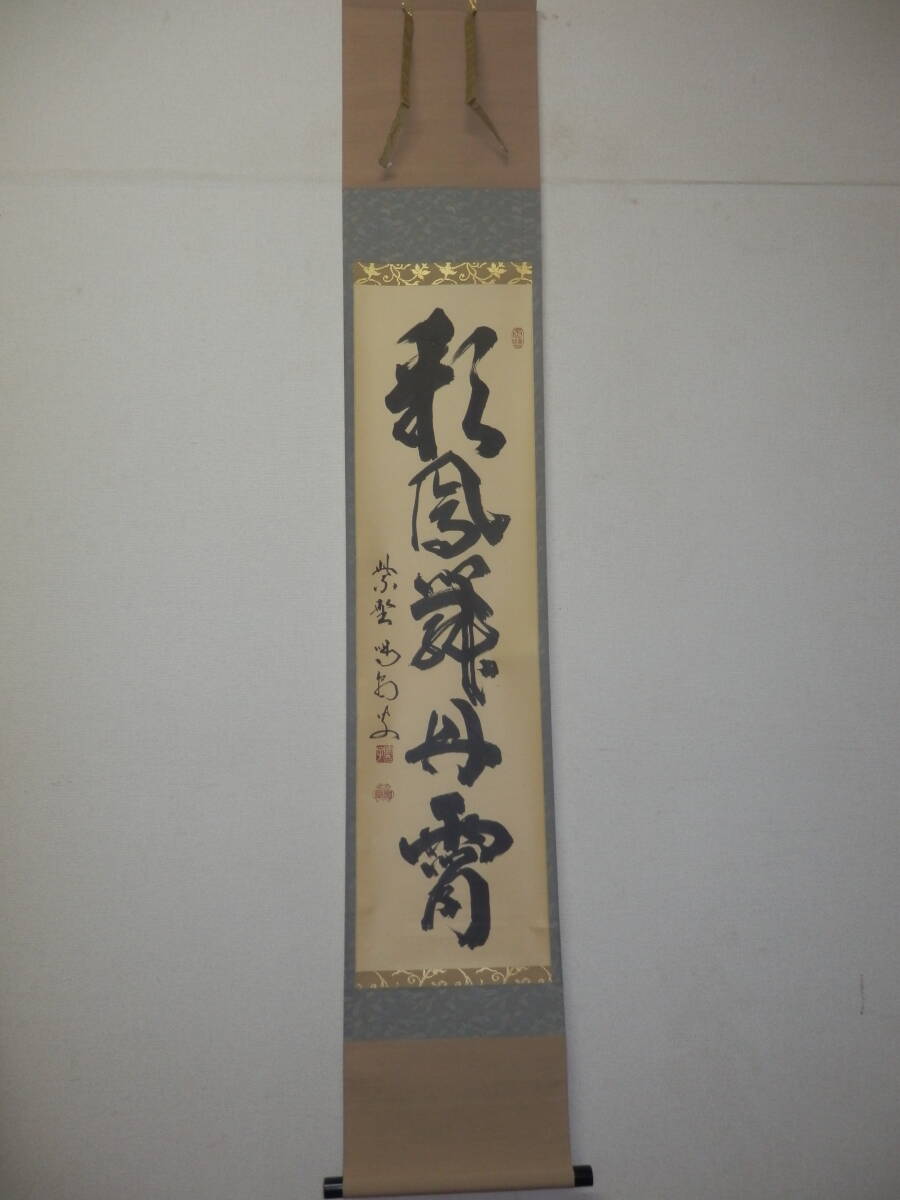 「中古品・掛軸」 大徳寺の龍源院の細合喝堂師筆の一行書の掛軸です。 「彩鳳舞丹霄」です。 シミ、折れ等有。 軸幅約36cm 長さ約176cm 桐共箱「ヤケ、シミ等有」。 『真作保証・真作でないと証明された場合は返品を承ります』。どうぞ宜しく。