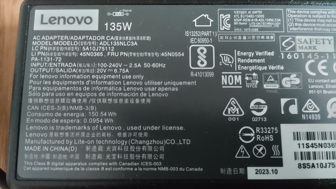 ★訳アリ★美品★Lenovo 135W ACアダプター スリムチップ 20V 6.75A