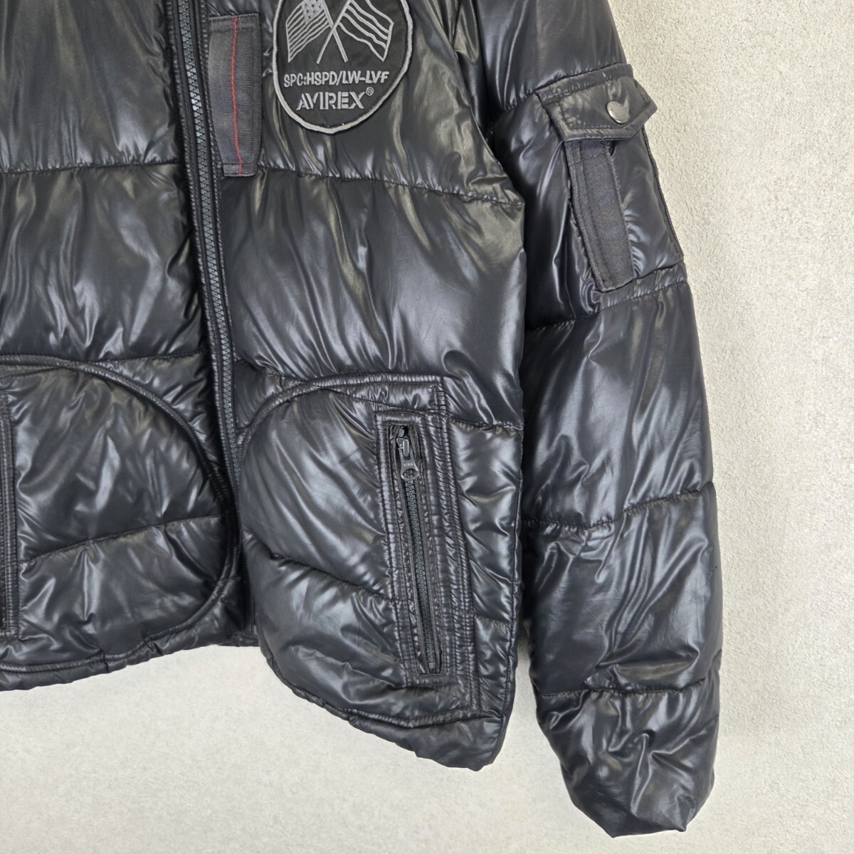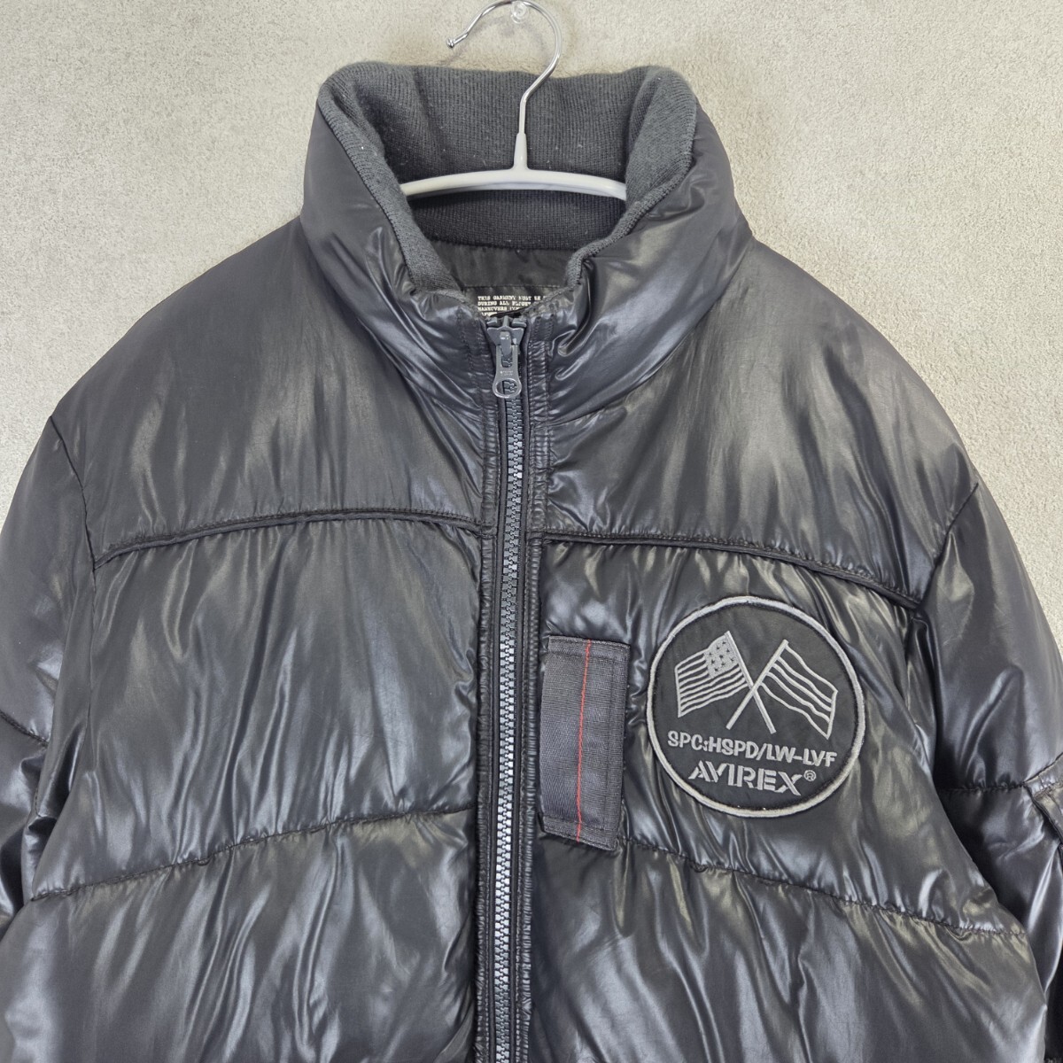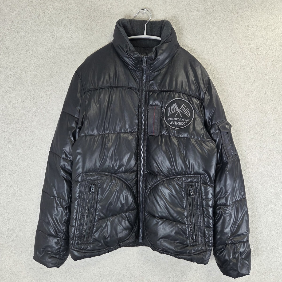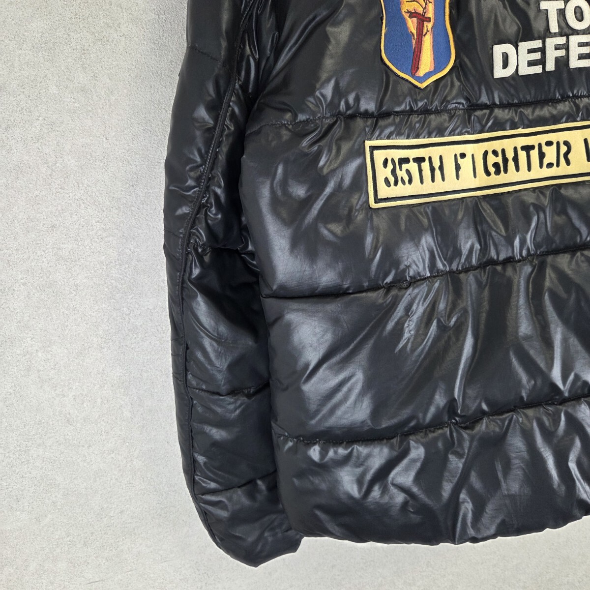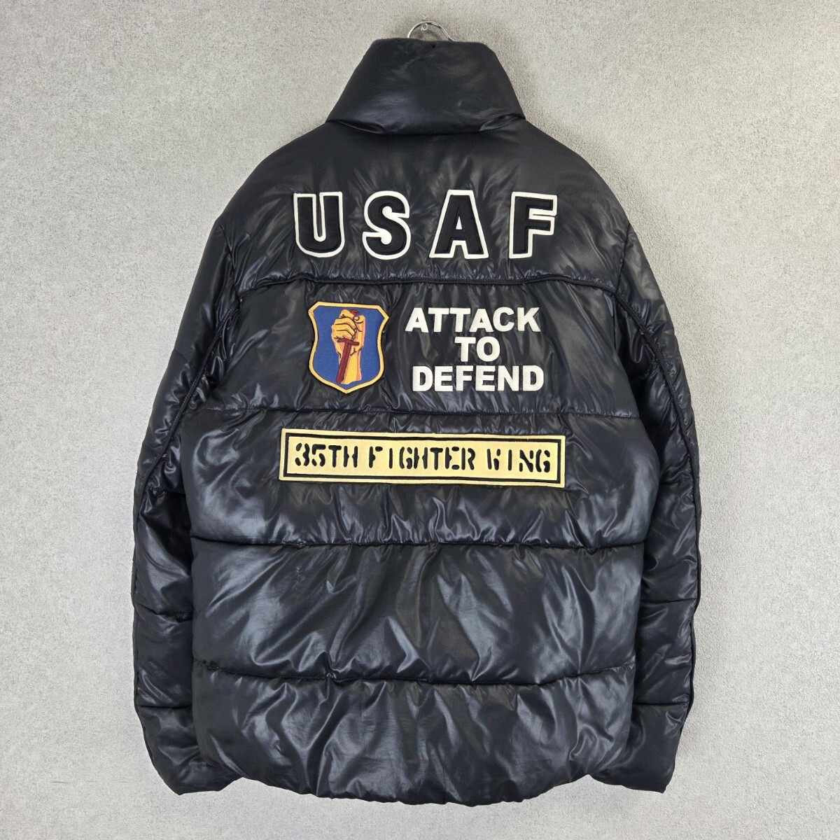 このダウンジャケットは、アメリカ空軍(USAF)をテーマにしたデザインで、特に「ATTACK TO DEFEND」という刺繍が印象的です。35th FIGHTER WINGの部隊名が入っており、ミリタリースタイルを強調しています。
