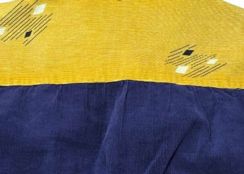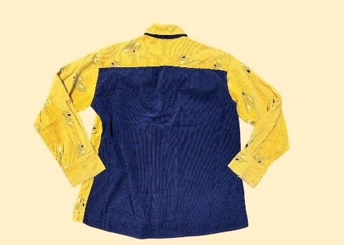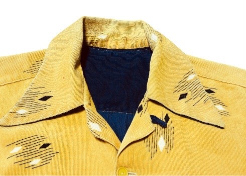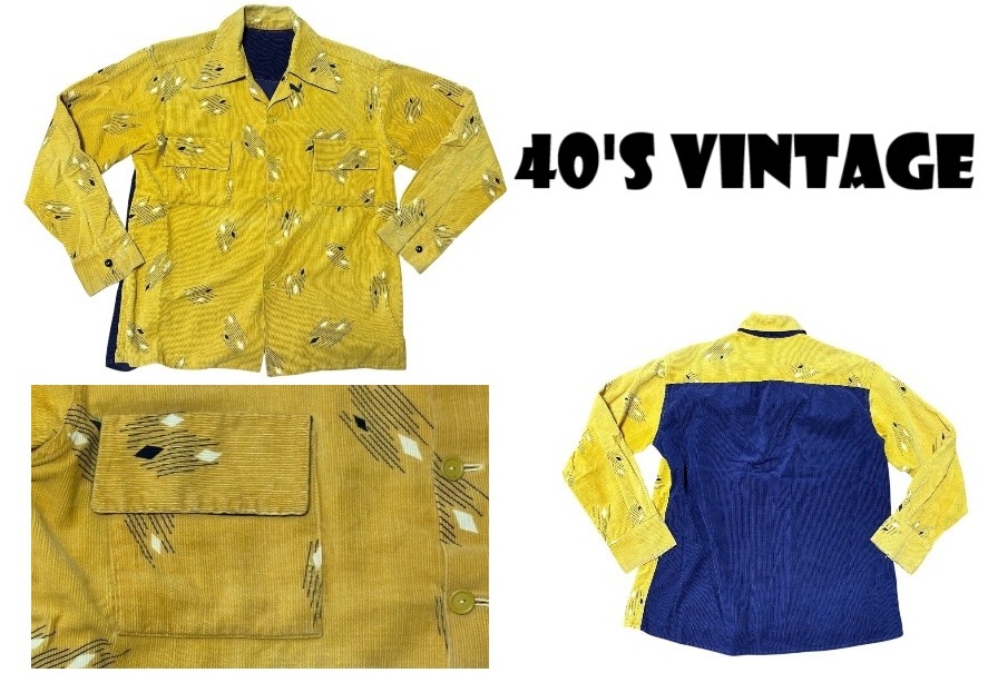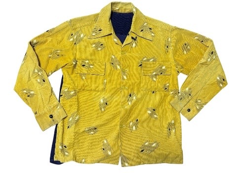 希少USA40’Sビンテージ★長袖コーデュロイ・シャツ★アトミック柄オープンカラー★プリーツ・バック★マスタードxネイビー★テーラー★XL