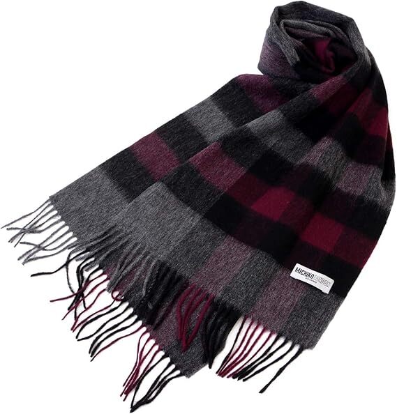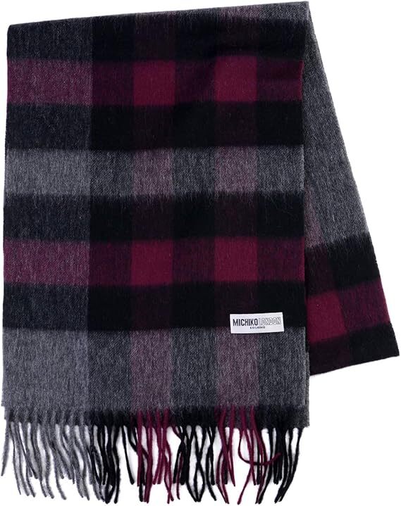 [ミチコロンドン] ブランドマフラー ウール100% 男女兼用 防寒 ブロックチェック ワイン/グレー系