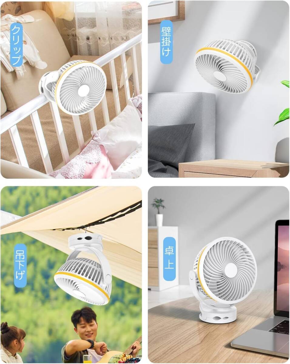 この扇風機は720度の角度調整が可能で、左右上下360度調整が可能です。卓上、吊下げ、壁掛け、クリップの4つの設置方法があります。