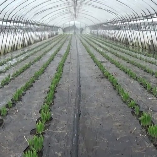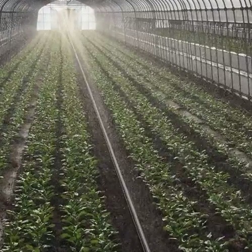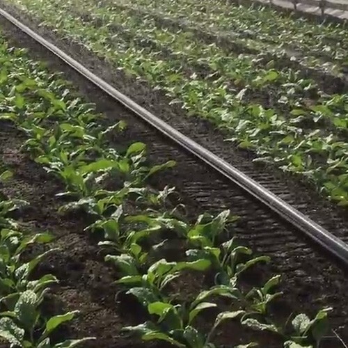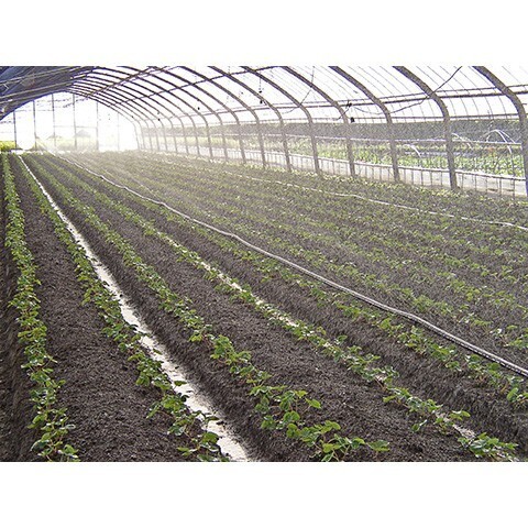 5.4m間口のハウスなら、これ一本で均一全面散水が可能。高畝の作物にも対応。