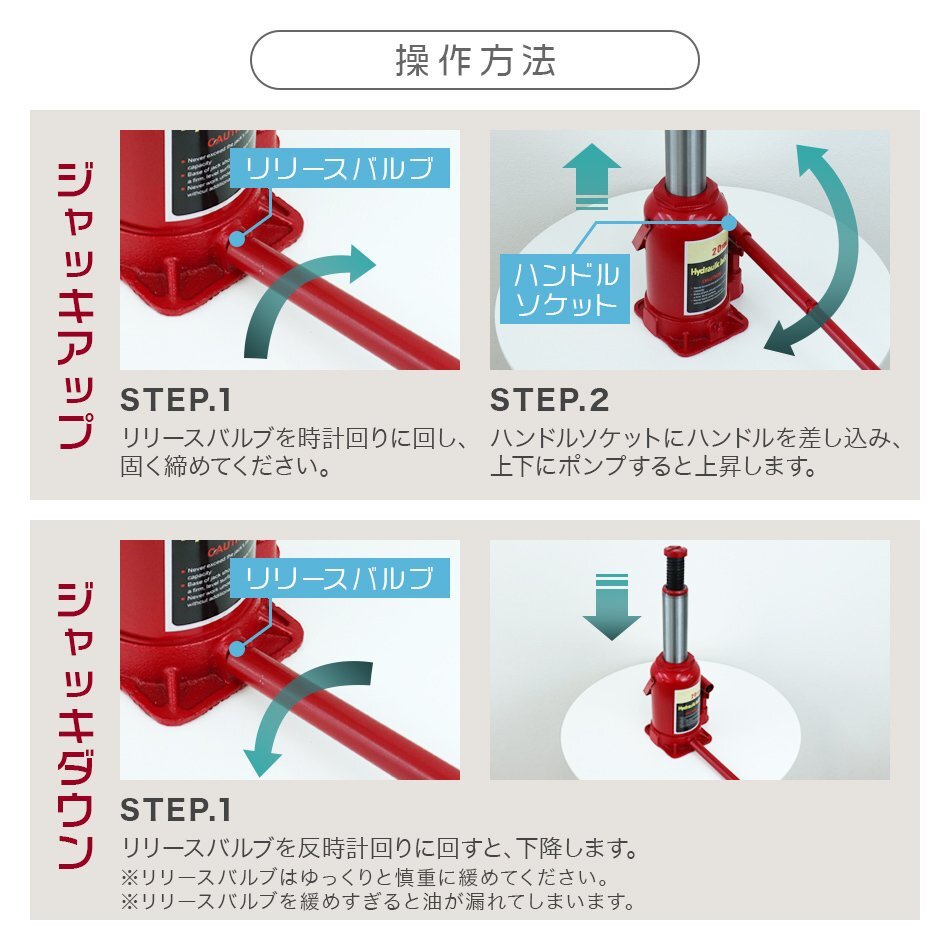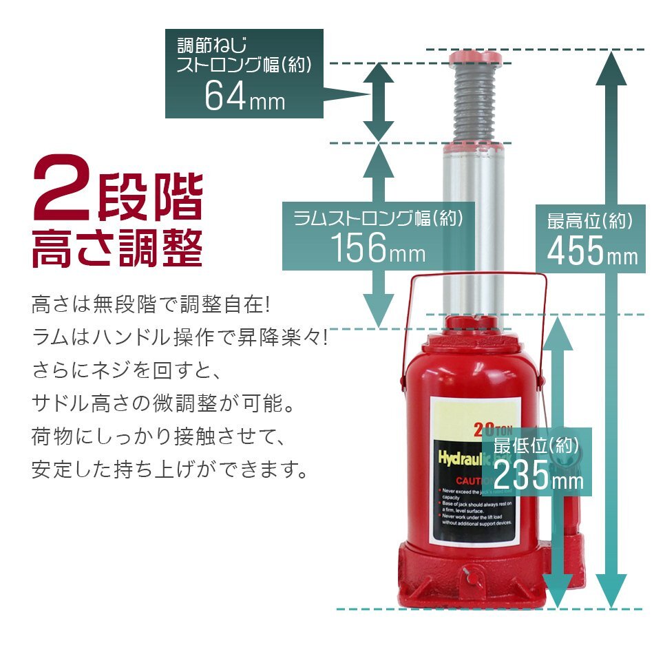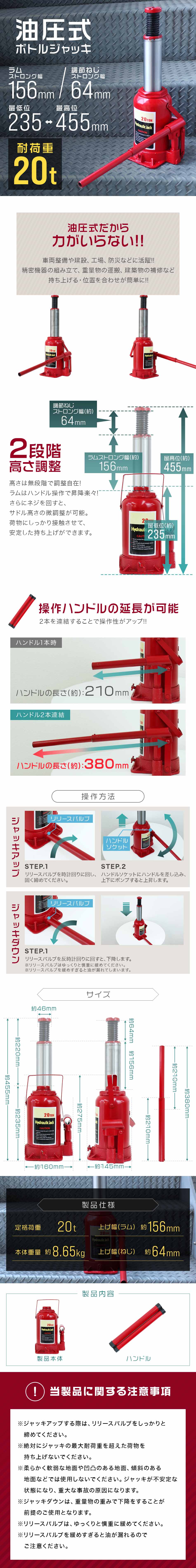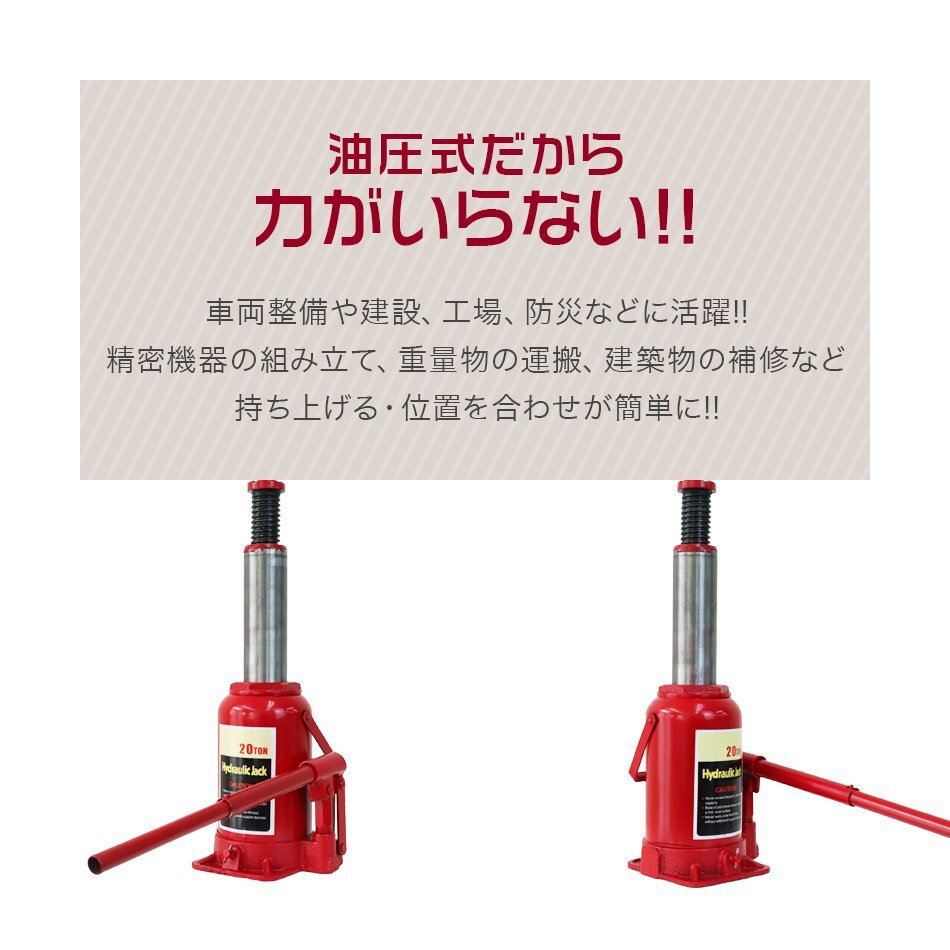 タイヤやホイール・マフラー交換など、車の整備に欠かせないジャッキです。 油圧式のため簡単にジャッキアップが可能です。 油圧ジャッキは持ち上げるだけの道具ではありません!! その他の道具と組み合わせることで、 ・押す ・潰す ・搾る 等のさまざまな用途で使用できます。 ★20t (20トン)油圧ジャッキ★ 【仕様】 ・安全荷重:20t ・ジャッキの高さ:235mm ・持ち上がる高さ:145mm ・ねじの上昇:60mm ・重量:10.5kg |