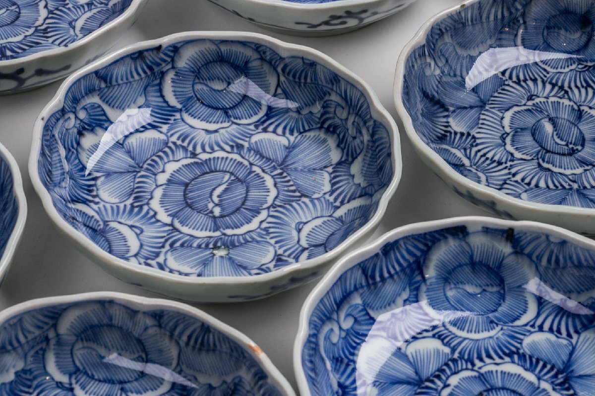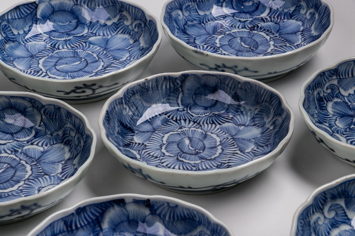 【うつわ】 古伊万里 染付線描き花詰め文なます皿 8客 江戸後期 E1708B バラ売り可能です 古美術 骨董 古玩 唐物 茶道具 日本料理 懐石
