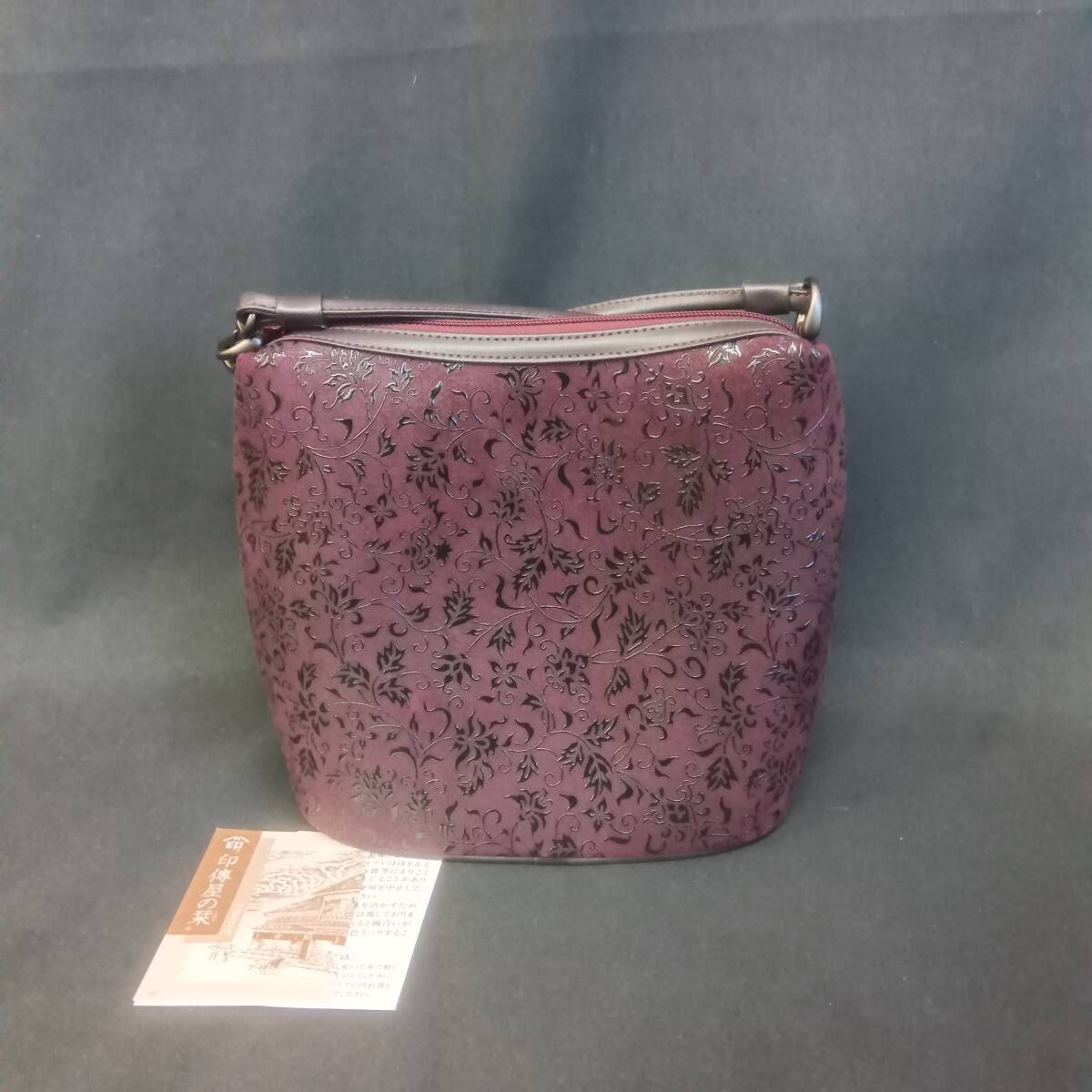 こちらは、日本の伝統工芸品である甲州印伝の老舗、印傳屋 INDEN-YA(インデンヤ)のショルダーバッグ(ポシェット)です。印伝は、しなやかな鹿革に独自の技法で漆をのせ、模様をつけた革製品で、古くから愛されてきました。本品は、落ち着いたボルドー(紫系)の鹿革に、黒漆で繊細な花唐草模様が施されており、和装・洋装問わず幅広いスタイルに合わせやすいデザインです。複数のファスナーポケット(ジッパー)を装備しており、見た目以上に収納力があり、貴重品や小物などを整理して持ち運ぶのに便利です。日本の職人技が光る、上質な革の質感と艶やかな漆の風合いを存分にお楽しみいただけます。軽量で耐久性にも優れており、日常使いはもちろん、旅行やサブバッグとしても重宝する一品です。