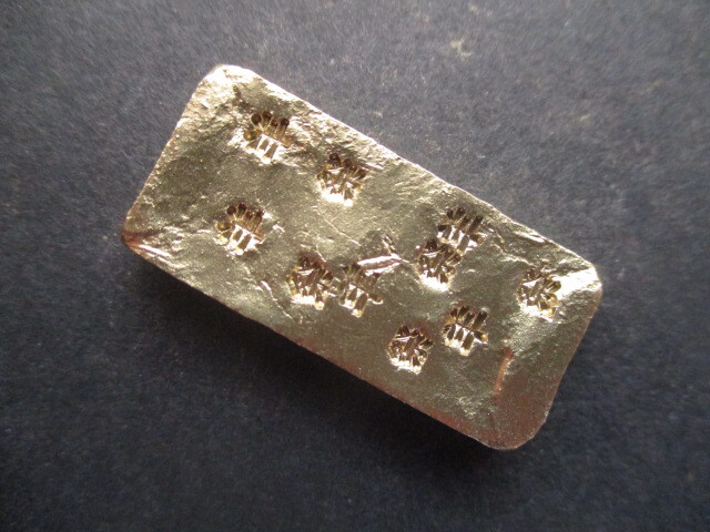 今回は委託品です。 正確な入手先を思い出せないものから順に処分する予定です。 江戸時代中期以降、御三家御三卿では延金の状態で金塊を所蔵していたと伝えられています。 様式の統一は何らかの協定が結ばれていたことを示唆しています。 八代将軍徳川吉宗の意向を反映しているとの説もあります。 今後の研究が待たれるところです。 今回の延金の表には現代のシリアルナンバーに相当する漢字打刻、裏には一橋家御金蔵の刻印「菱窓双星」が認められます。 傷や汚れなど状態についての詳細情報は画像でご確認ください。 撮影の際の光の量によって実物と違った色に写ることがあります(3枚目の画像が最も実物の色に近いように思います)。 タイトルに記載した量目は写真撮影の際に先方(委託者)宅で測定した値です。 計量器の誤差は0.2g以内と聞いています。 とりあえず本物と信じて購入したそうですが、入手以来一度も鑑定に出したことがなく、トラブル防止のためあえてレプリカとして出品させていただきます。 また、金品位を記載した保証書が見当たらないとのことですので、非金製品として出品させていただきます。 開始価格は買い値の十分の一以下とさせていただきますので「レプリカ・非金製品」を前提に無理のない範囲でご入札ください。 寛永通寳は商品に含まれません。 高騰防止のため即決価格をご用意しました。 自己紹介欄にオークション休業日を記載させていただいております。 お手数とは存じますが、ご入札前にお読みいただければ幸いです。 よろしくお願い申し上げます。