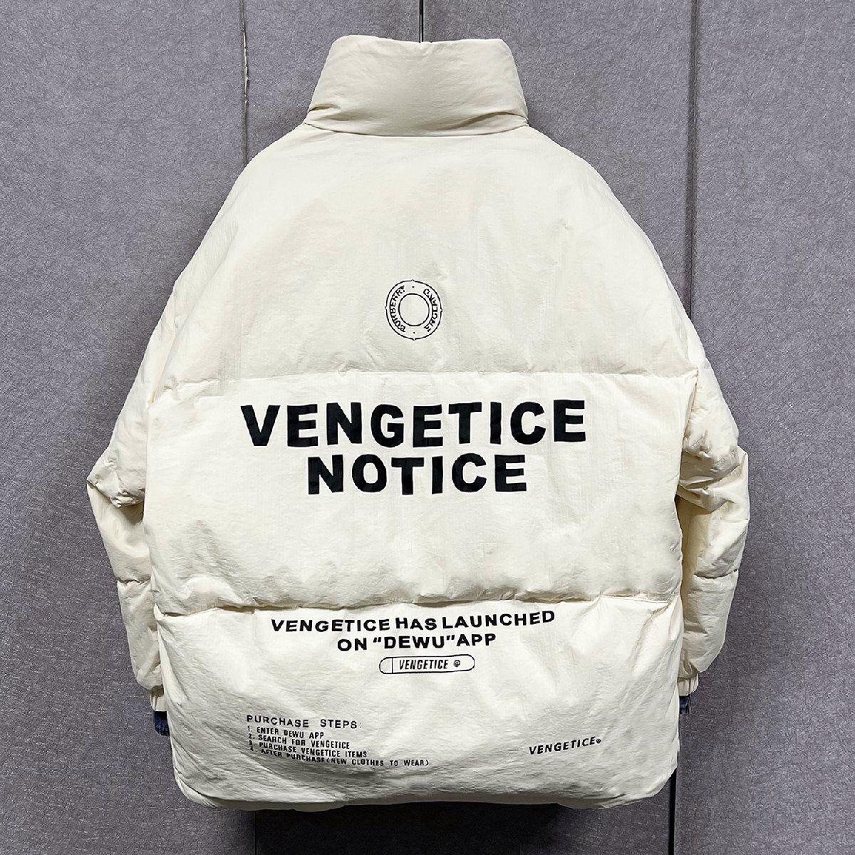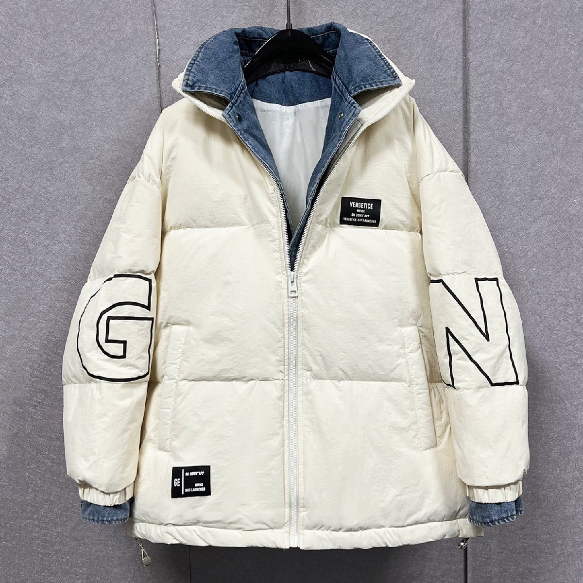 クラシックで現代スタイルの英字柄ダウンジャケット。