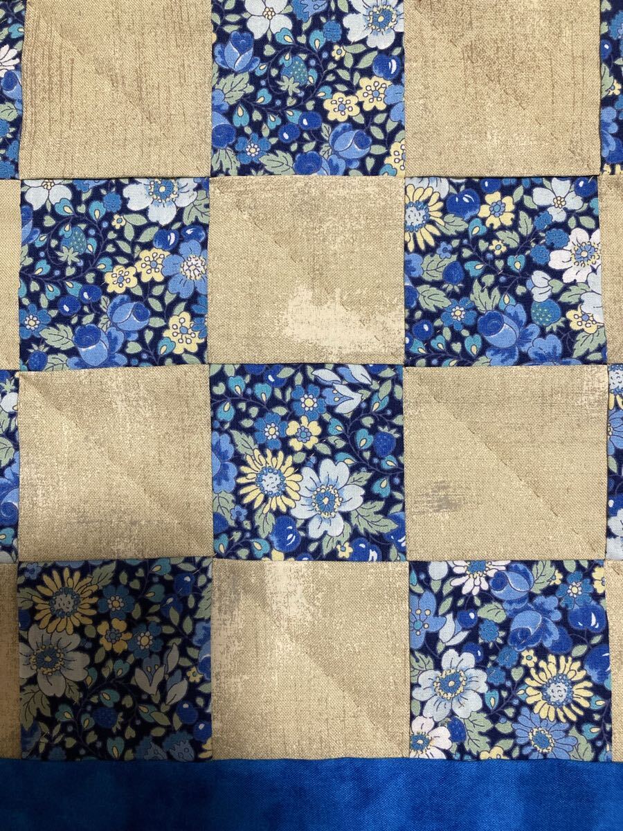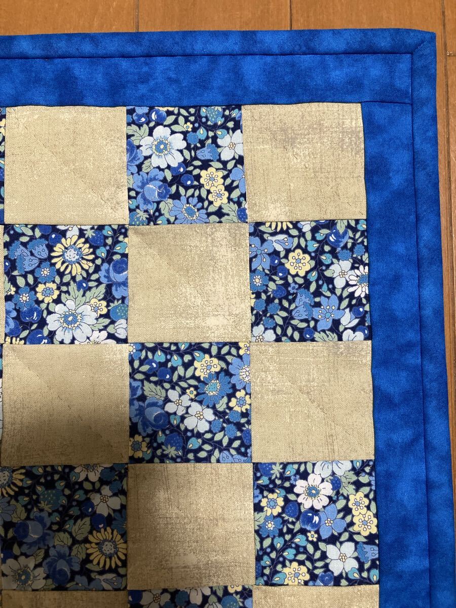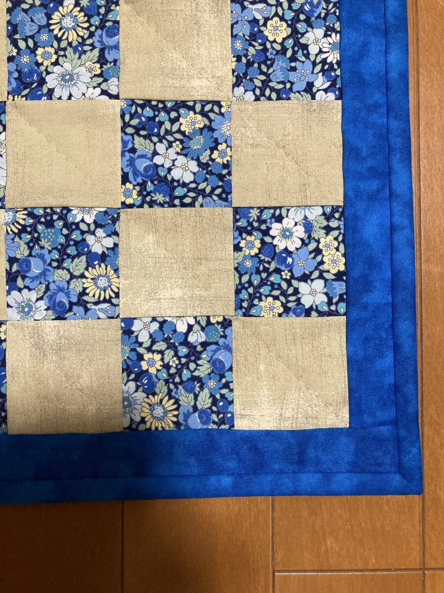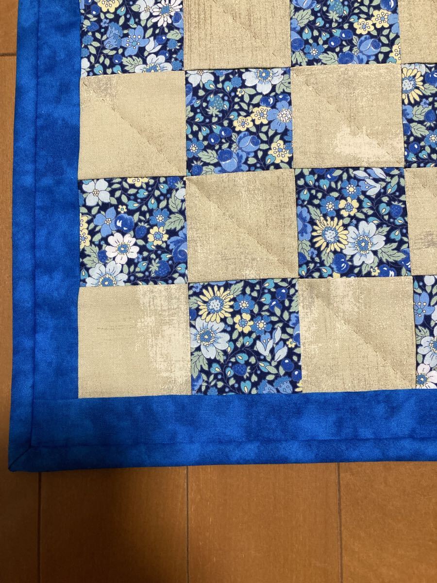 青系の花柄生地とくすみの生地を使い、スクエア(正方形)をつなげて作りました。