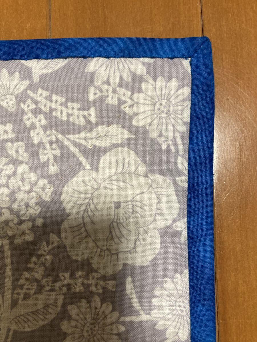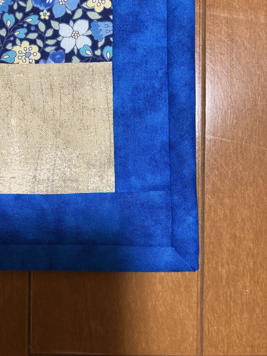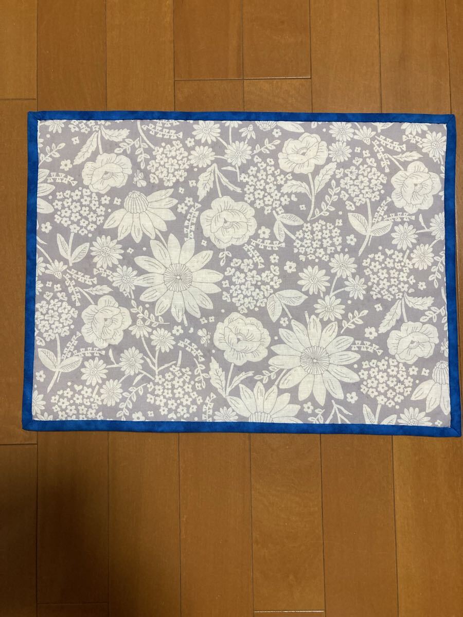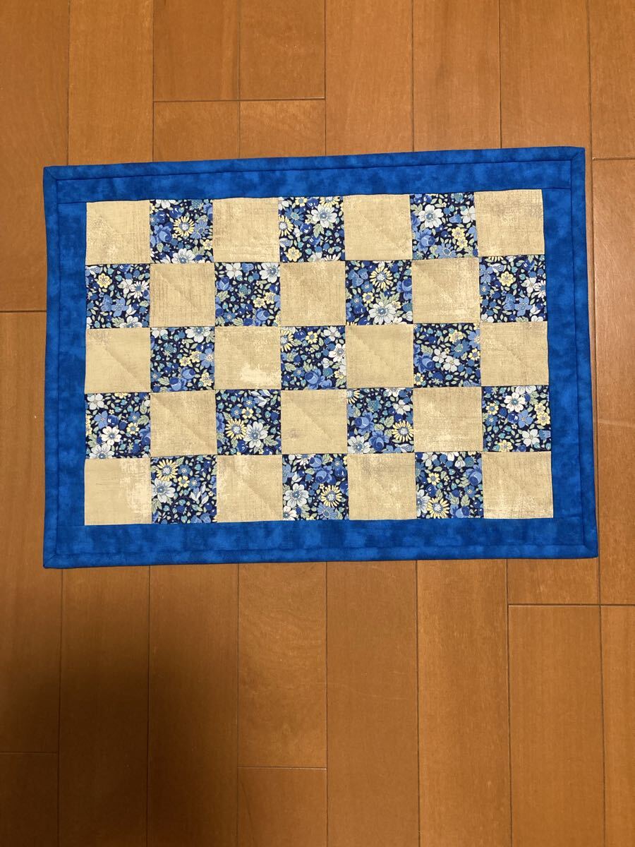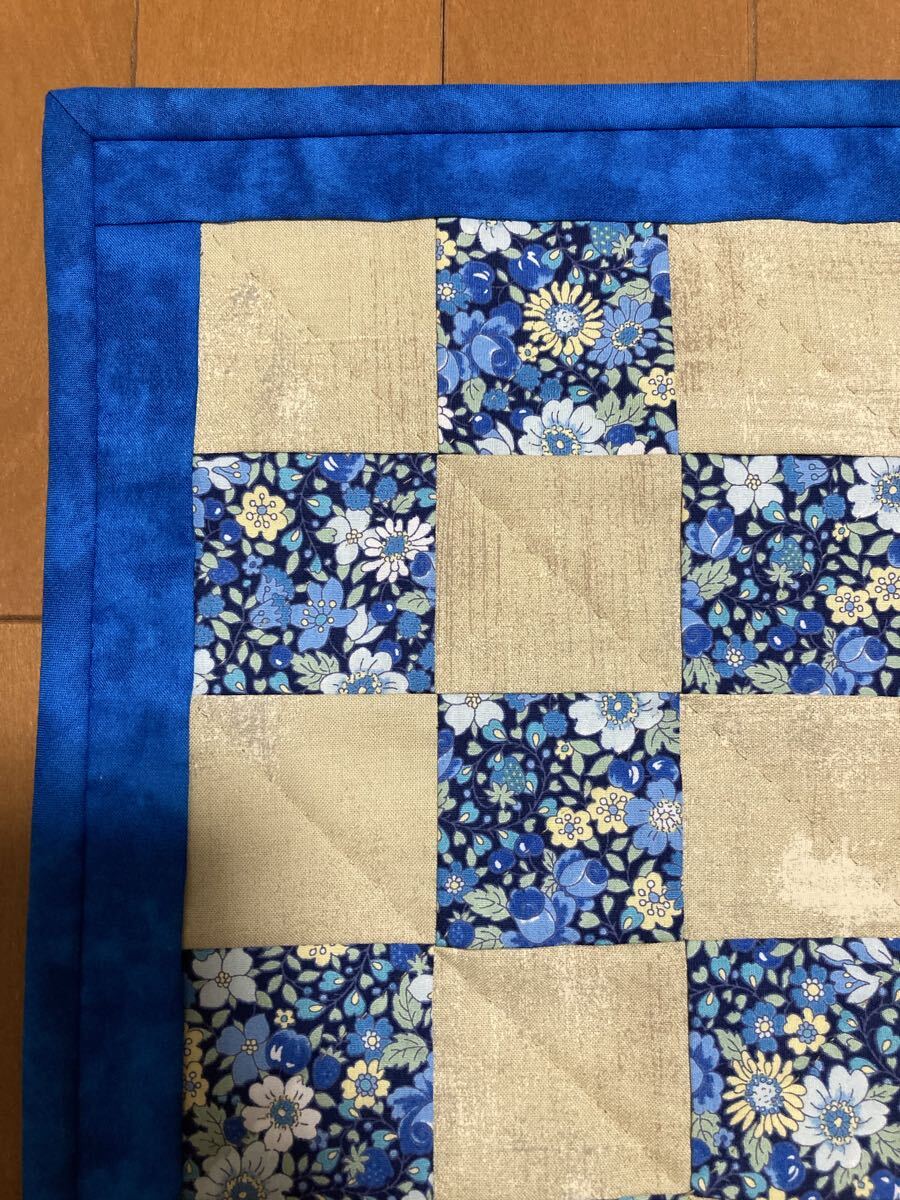 青系の花柄生地とくすみの生地を使い、スクエア(正方形)をつなげて作りました。