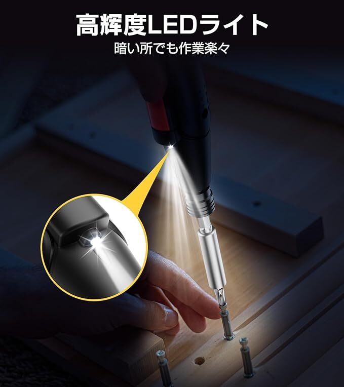 • 【高輝度LEDライト・コンパクト・軽量・コードレス設計】 電動ドライバー 小型には、作業中の手元を明るく照らす高輝度LEDライトが搭載されています。スイッチを押すとLEDライトが点灯し、暗所や狭い場所での作業を格段に効率化。コンパクトで軽量なボディは、持ち運びやすくて、ボタン一つで正回転と逆回転を簡単に切り替えられるため、精密機器の修理やメンテナンス、自転車や家具の組み立て、家電製品の簡単な修理、DIYプロジェクト全般、さまざまなシーンで活躍します。