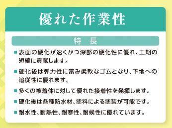 〇硬化後は弾力性に富み、柔軟なゴムとなり。下地への追従性に優れます