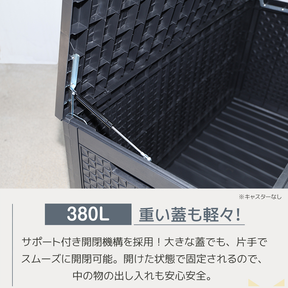 • 380L:【重い蓋も軽々!】サポート付き開閉機構を採用!大きな蓋でも、片手でスムーズに開閉可能。開けた状態で固定されるので、中の物の出し入れも安心安全。【さらに強固な天蓋!】蓋内側にスチールプレート補強!蓋の強度を大幅アップ!より高い耐荷重性を実現し、重い物を載せてもたわみにくい設計です。
