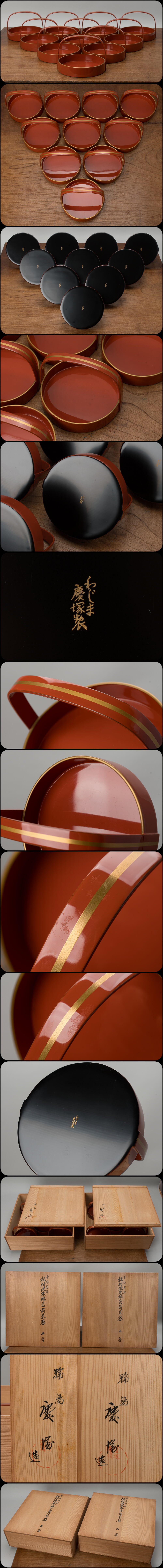 | 輪島慶塚作、輪島塗前菜器10客(5客x2箱)。共箱有。真作保証。 もちろん、本木地・本漆塗です。 サイズは、幅約14cm、高さ約10.5cm。 状態は良好です。 傷・直し・ヤケ・歪み等ありません。 画像のような汚れはあります。。 状態・詳細は、画像でご確認お願いいたします。 |