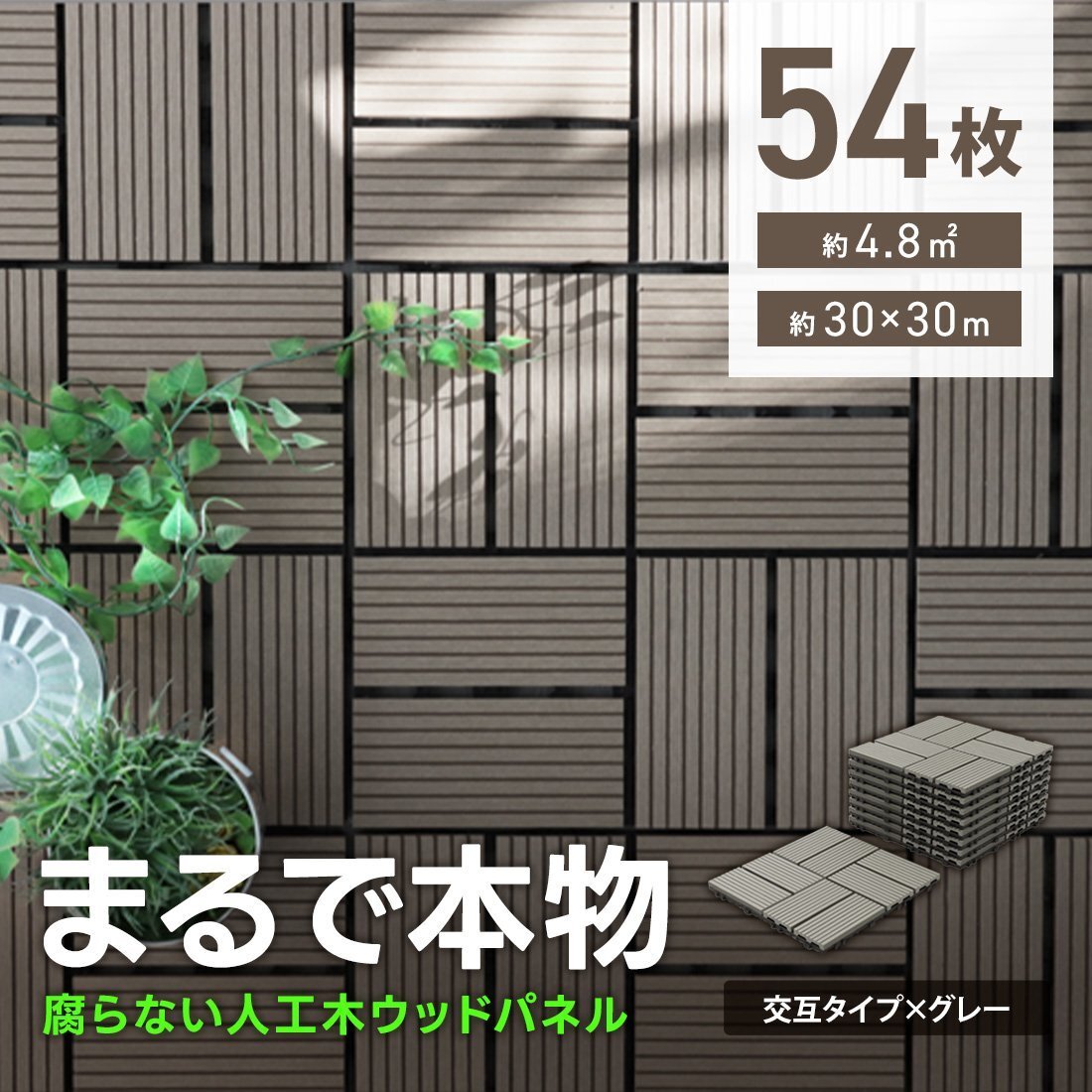 | パズルみたいにサイドの凹凸を繋ぎ合わせるだけで簡単に施工が出来るジョイント式ウッドタイル! ベランダの雰囲気を変えたり劣化してきたベランダの修復に最適! 雨や日差しによる劣化に強く耐腐食性もある人工木を使用。 55%の天然木粉と45%の樹脂で出来ており、天然木製と比べると定期的なお手入れも不要! 小さなお子様やペットにも安心。さらっとした感触でささくれや釘による怪我の心配もなし。 安全に長期間使用できる優れものです! 【商品詳細】 カラー:グレー(交互タイプ) 表面のサイズ(約):幅29.5cm×長さ29.5cm×高さ2cm ジョイント部分も含んだサイズ(約):幅30.5cm×長さ30.5cm×高さ2cm 表面隙間:5mm 重量(約):0.9kg 圧力強度:3000N 材質:WPC素材(木材・プラスチック複合材) 表面・・・人工木(天然木の木粉55%入り) 裏面・・・ポリプロピレン樹脂 【商品内容】 ウッドパネル × 54 |
