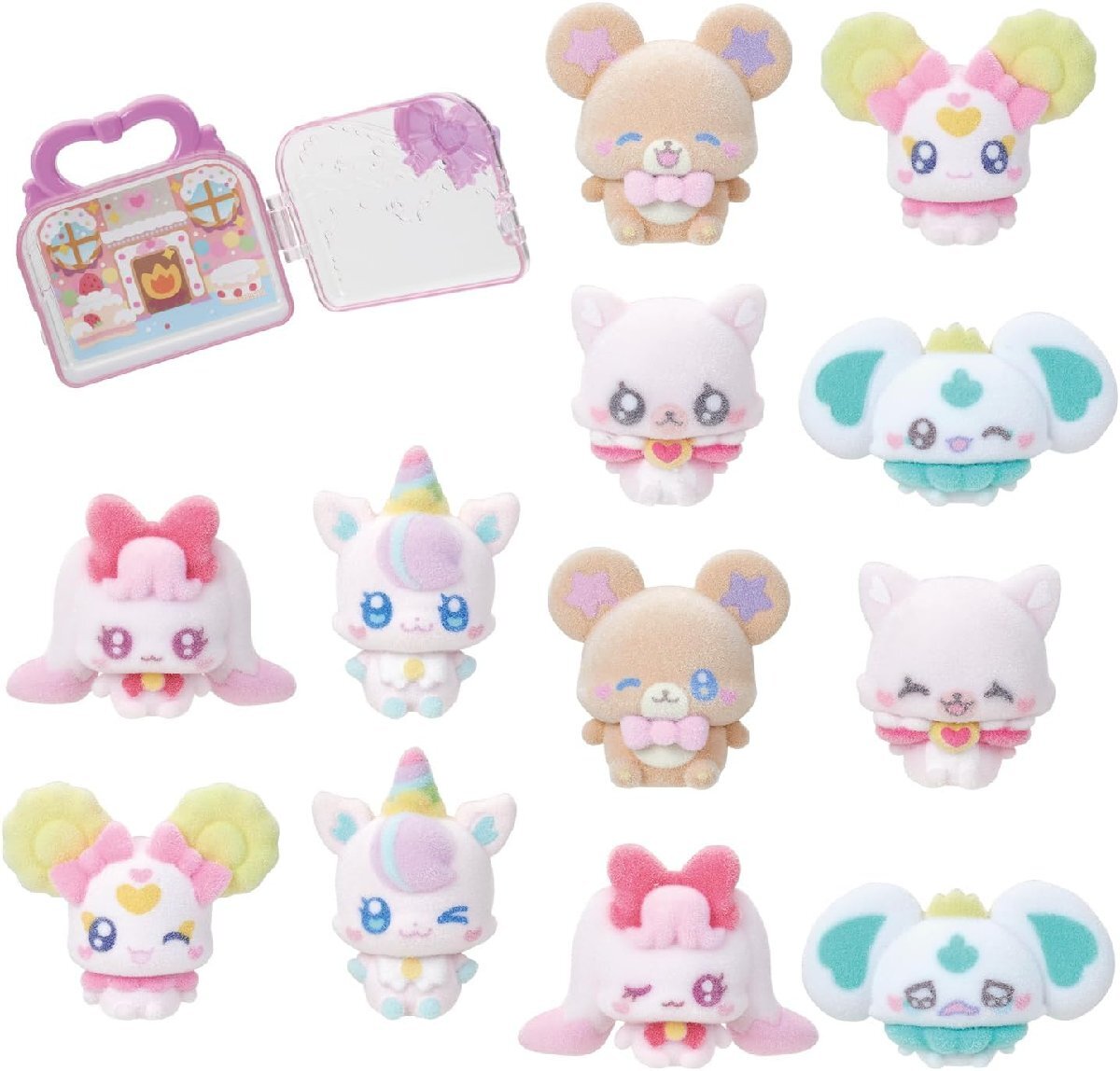 ぷちきゅあの可愛いフロッキーフィギュア2個と、毎週配信のショートアニメにも登場するハウス1個がセットになった商品で、ラインナップ全6種をコンプリートできる商品です。