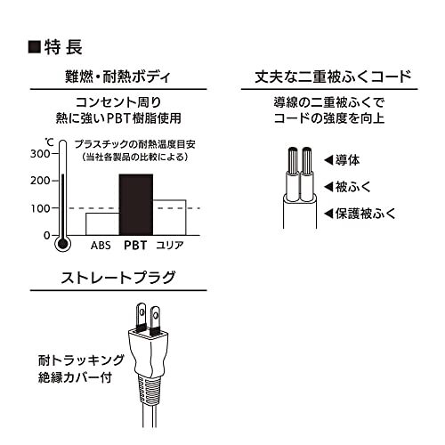 特 長 ● 難燃・耐熱ボディ:コンセント周りに熱に強いPBT樹脂使用 ● 丈夫な二重被ふくコード:導線の二重被ふくでコードの強度を向上 ● ストレートプラグ:耐トラッキング絶縁カバー付 ● カラーは白 仕 様 コンセント:1個口 プラグ形状:ストレートプラグ AC出力:1500W以下 コード長:1m