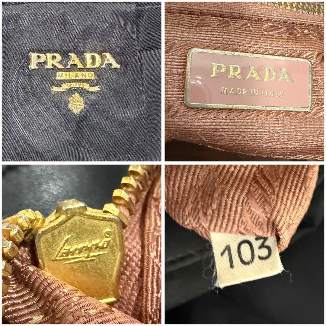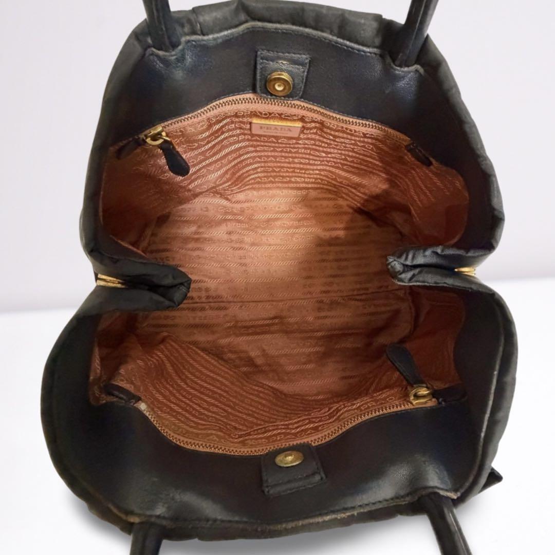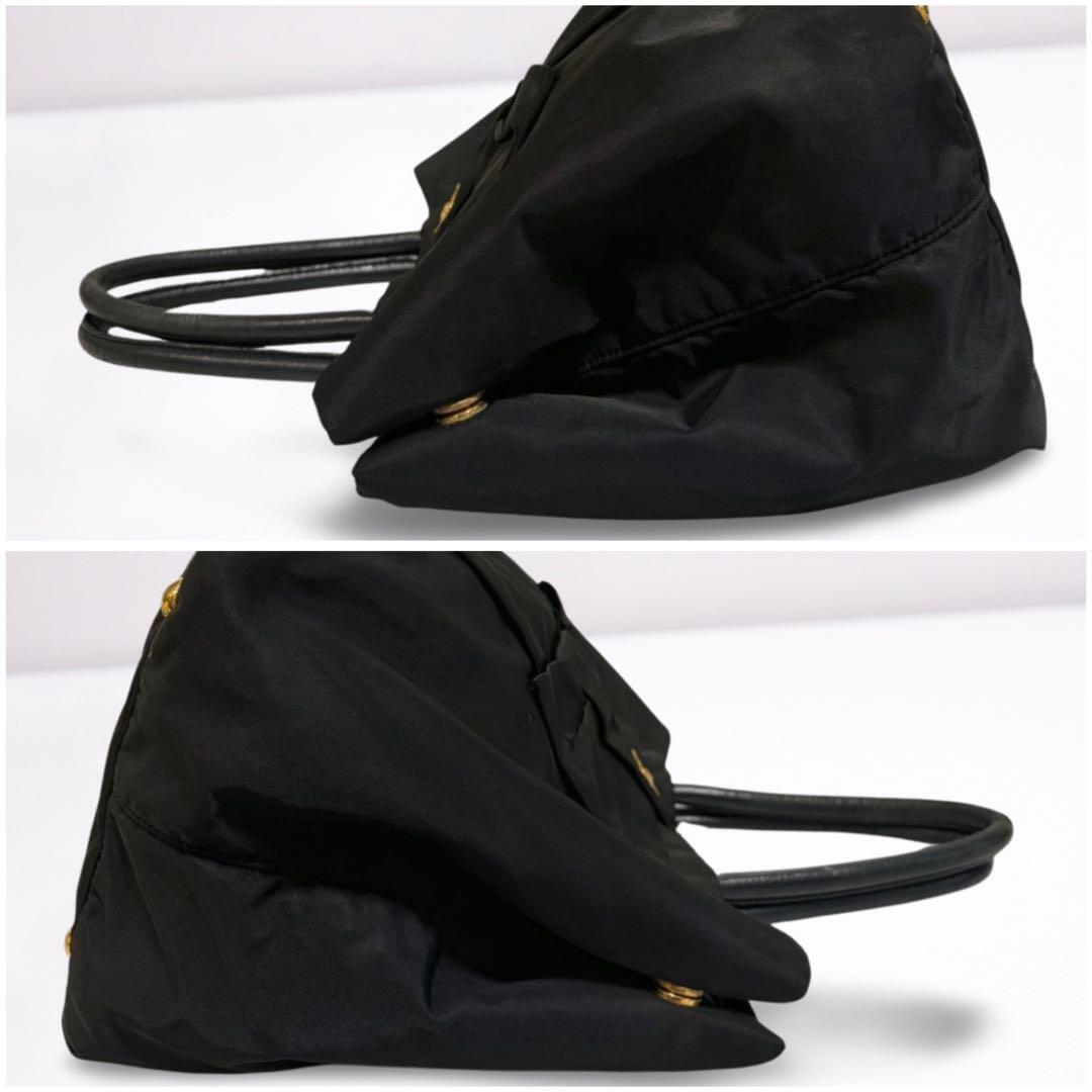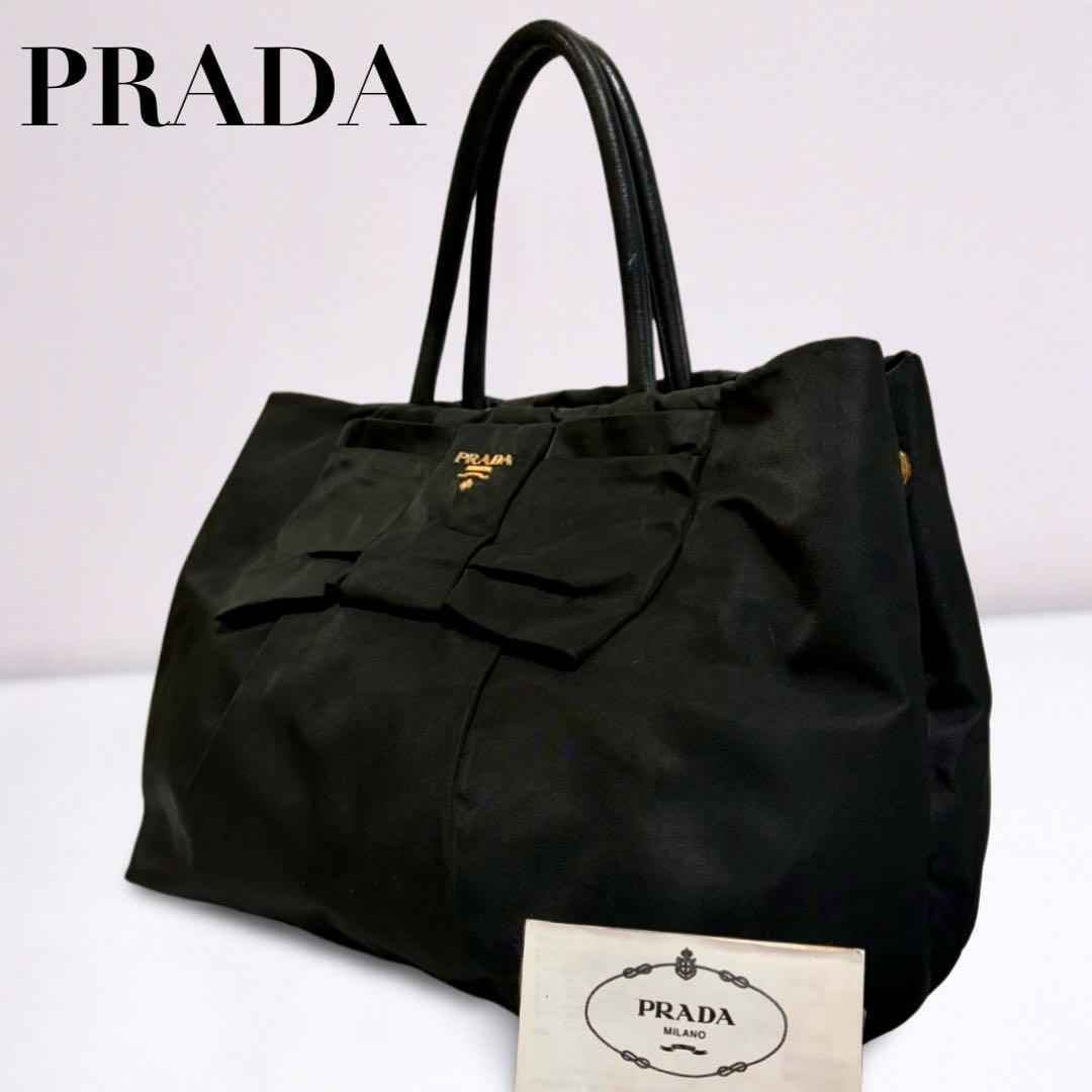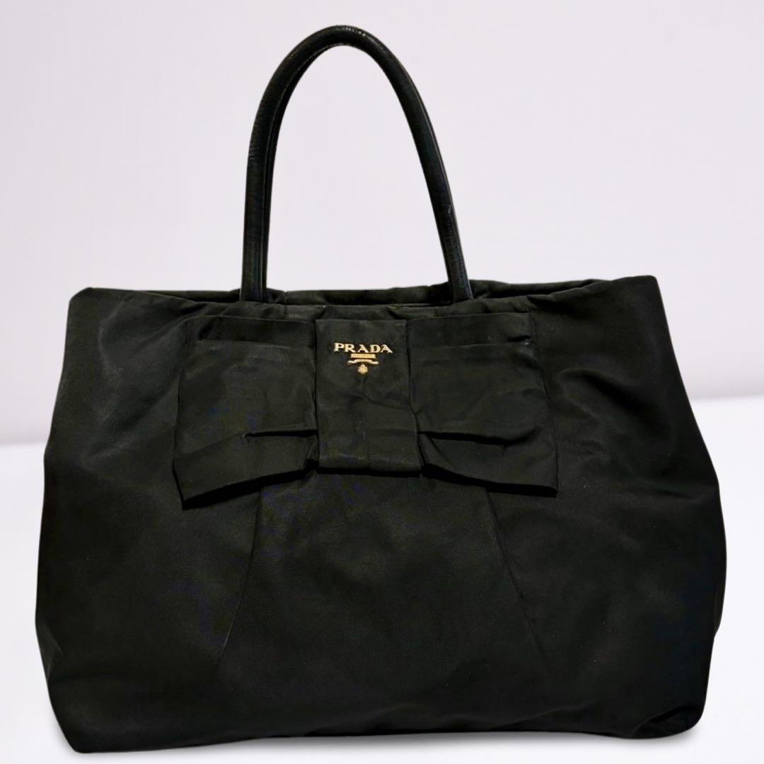 ゴールドのPRADAロゴが輝く、上品なリボンデザインのハンドバッグ。軽量ナイロン素材で自立可能、デイリーにもビジネスにも活躍します。内側はピンク系ジャカード生地で高級感あり。