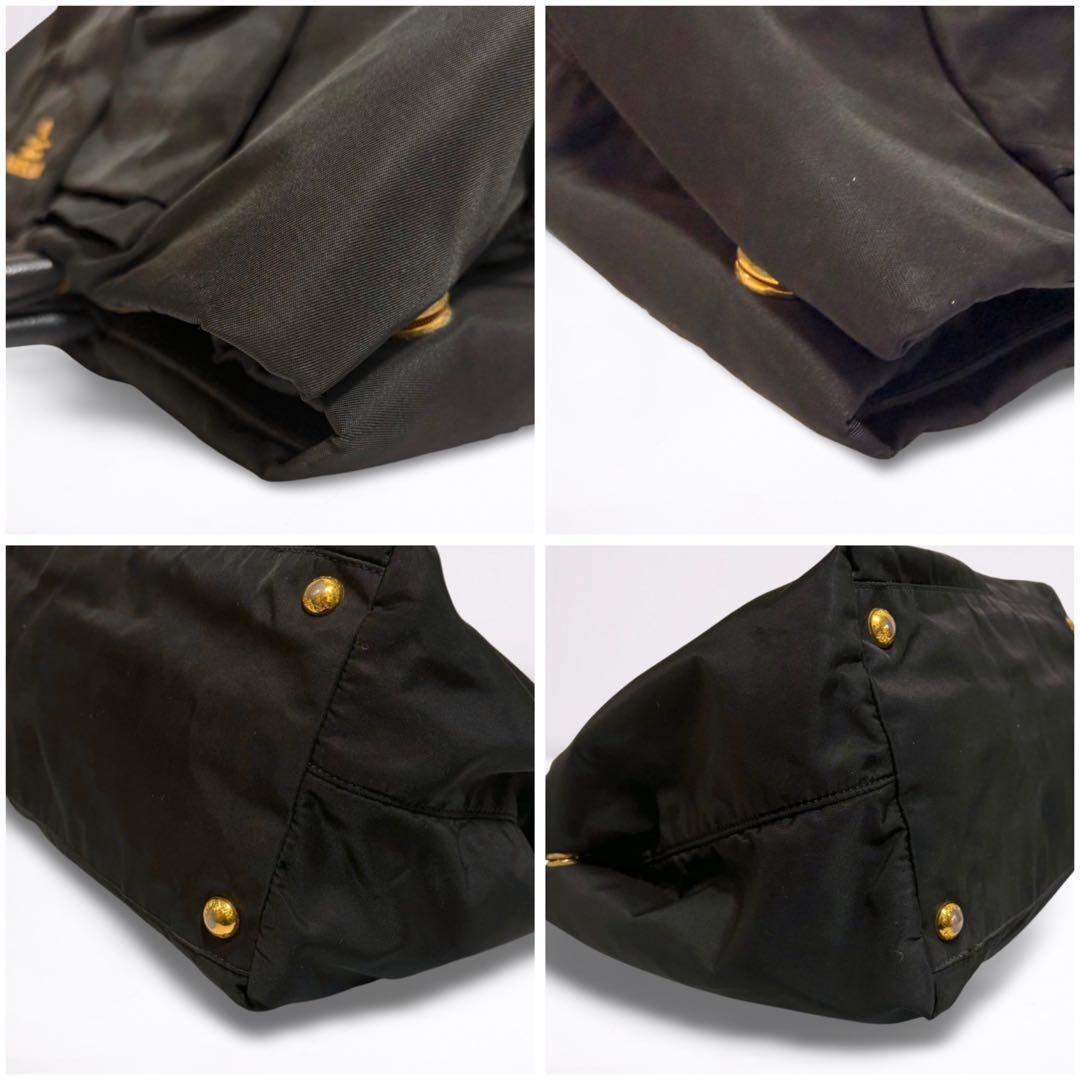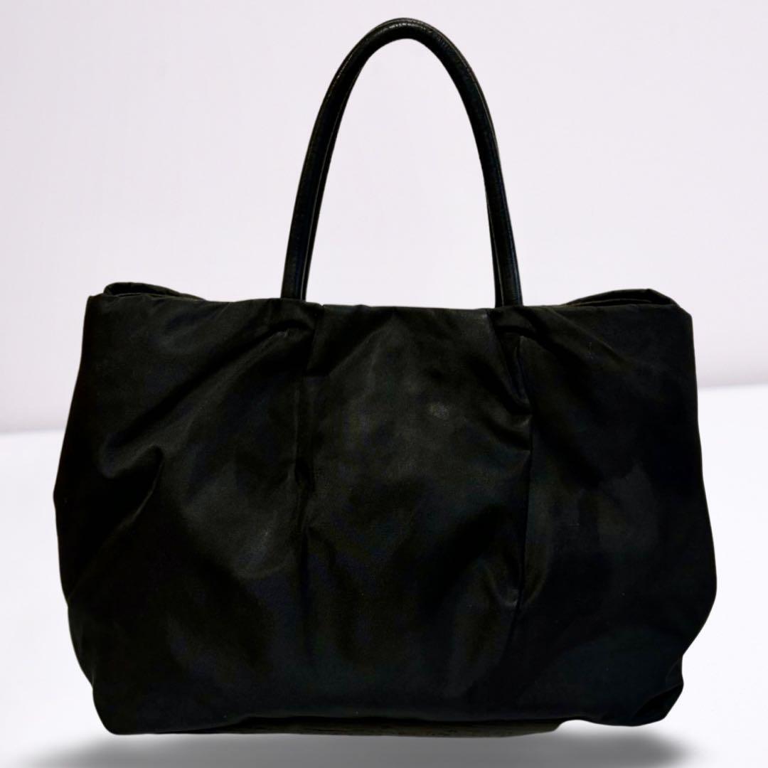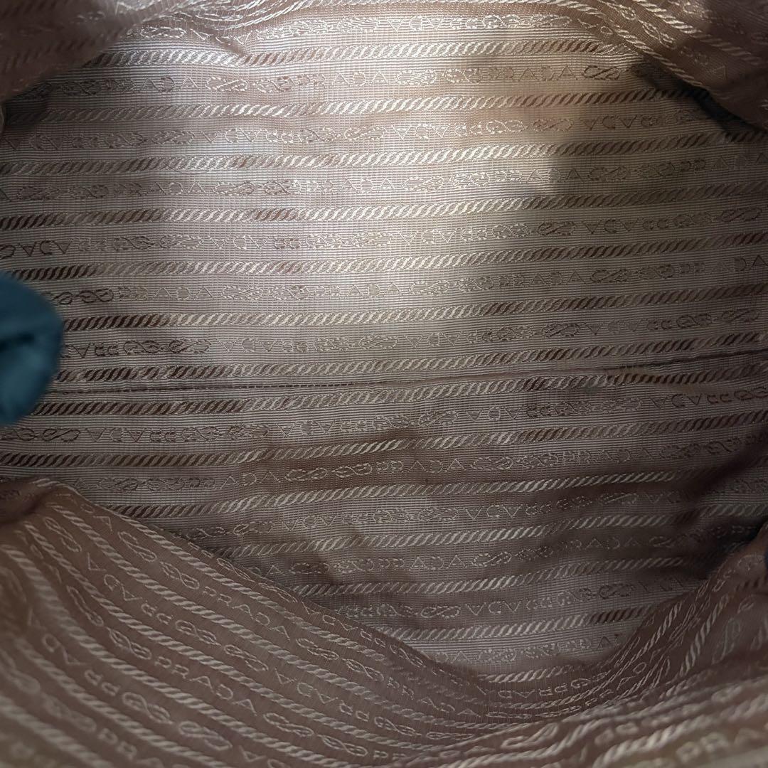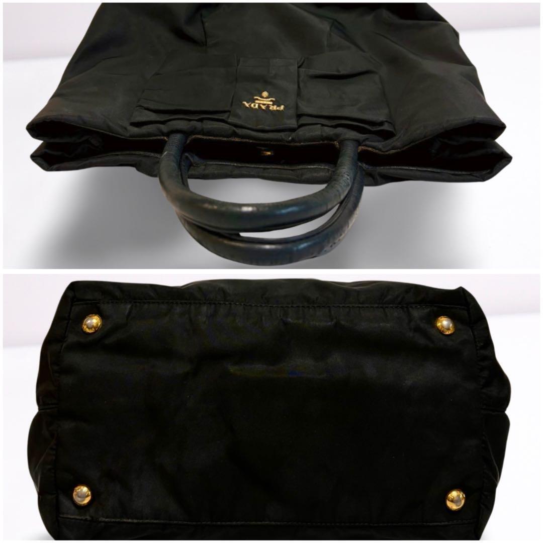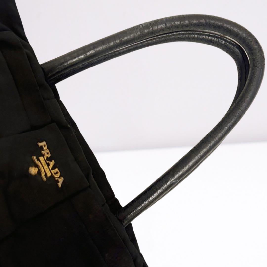 ゴールドのPRADAロゴが輝く、上品なリボンデザインのハンドバッグ。軽量ナイロン素材で自立可能、デイリーにもビジネスにも活躍します。内側はピンク系ジャカード生地で高級感あり。