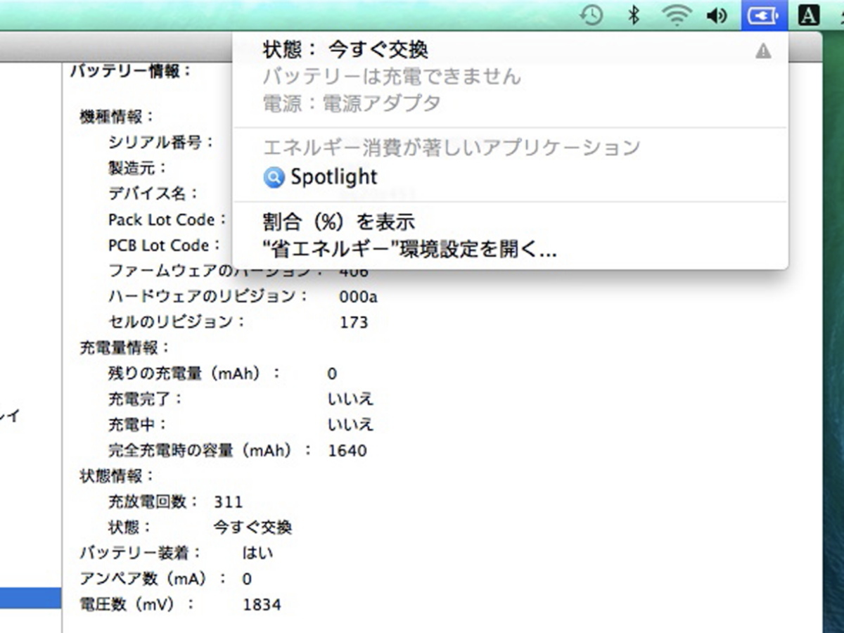 | 商品説明 | Apple MacBook Air (11-inch, Mid2011)/MacBookAir4,1 ★ デュアルコア Intel Core i5 プロセッサ。小さなサイズに圧倒的な性能を ★ すべてがフラッシュストレージ。気持ちいいほど瞬時に動き出す ★ 高解像度ディスプレイ数百万のピクセルを、ミリの薄さの中に ■メーカー:Apple ■OS:OS X Mavericks 10.9.5 ■ディスプレイ:LEDバックライト搭載11.6インチ高解像度ディスプレイ1,366 x 768ピクセル ■CPU:デュアルコア1.6GHz Intel Core i5、4MB共有三次キャッシュ ■メモリ:4GB ■フラッシュストレージ:128GB ■CDD:無し ■通信機能:AirMac Extreme(802.11n)、Bluetooth 4.0 サイズ/重量 高さ:0.3 - 1.7 cm 幅:29.95 cm 奥行き:19.2 cm 重量:1.06 kg ■状 態■ OS X Mavericks 10.9.5 までアップデート済です。 ※リカバリディスクは付属しません。 ※起動パスワードは「1234」に設定しています。 電源投入自己テストの結果は合格となっています。 すべてテストしてはありませんが、主要なアプリケーションは 問題なく起動できております。 無線LAN接続で、Safariにてインターネット接続できました。 キーボードの入力できました。 初期設定に使用したキーには反応しないキーはありませんでしたが、 全てのキーは確認していません。 一部のキートップに塗装の劣化があります。 「M」キーのキートップの塗装が一部剥がれています。 スペースキーの塗装が一部浮いたようになっています。 トラックパッドの操作可能です。 クリックボタンも使用可能です。 バッテリーは充電不可のため、バッテリーでは起動しません。 現状では、MagSafeアダプターを接続しないと起動しませんので御注意下さい。 また、バッテリーが使用できないため、初回通電時はアダプターを 接続するだけで電源が入り、OSが起動します。 アダプターを外さなければ、2回目以降は電源ボタンで起動できます。 【バッテリ】 動作確認時点でのバッテリー情報(参考): ・完全充電時の容量:1640mAh ・充放電回数:311回 ・状態:今すぐ交換 ※上記バッテリー情報は、バッテリー性能を保証するものではございません。 ※ACアダプターは付属しませんので、落札者様で御用意下さい。 ※ACアダプターは単品で出品しておりますので、落札いただければ同梱可能です。 目視で確認したところでは、液晶にライン抜けなどの症状は無いようです。 画面に保護フィルムを装着していましたので、綺麗な状態だと思います。 簡易清掃済ですが、天板やキーボードにキズ・汚れなどがございます。 ※現状では起動は可能ですが、不調箇所(バッテリー)がありますので、 アダプターを接続しても起動しない等の初期不良を除き、ノークレーム・ノーリターンと致します。 使用開始後に発生した動作不良には対応できませんので、御了承下さい。 ※即決落札の場合でも、発送は通常終了の翌日 木曜日以降になります。 ※発送までの取り置きは可能ですが、早期発送はできませんので、御注意下さい。 ■この商品に対する注意事項 液晶のドット抜け及び液晶の色むらは、液晶の構造上起こる場合がございます。 初期不良対象外になり、交換致しかねますので、予めご了承ください。 ■付属品■ 無し ■発送方法■ ゆうパックで発送予定です。 送料は梱包費用込みとなっております。 ■お支払い方法■ ヤフーかんたん決済 出来るだけ良い物を、出来るだけ良心的な価格で 提供出来ますよう、これからも努力して参ります。 アイテムはドシドシ更新して参りますので、気に入って頂けましたら、 当方のIDをオークションアラートに追加して頂けますと幸いでございます。 最後まで御覧頂きましてありがとうございました。 | |