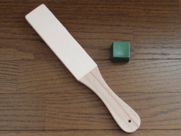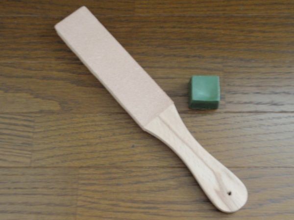 両面革張り、表のざらざらの粗い面に付属の緑色の研磨剤塗り込んで研いだあと裏面の滑らかな面で研いで仕上げます。