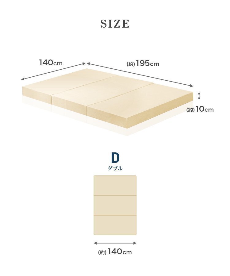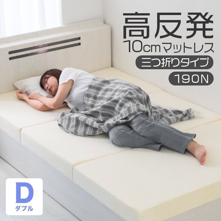 | 厚みたっぷり10cm! 適度な硬さで身体をしっかり支える、三つ折りタイプの高反発マットレスです。 柔らかいマットレスとは違い、身体の沈み込みを軽減した腰に優しい寝心地です。 高反発マットレスのウレタンフォームは弾性が高く、 適度な硬さで身体を支えるので、底つき感もなくへたりにくいマットレスです。 寝返りが多い方や仰向けに寝ることが多い方におススメです。 簡単にたためる三つ折りタイプなので、お部屋で立て置きして日当たりのいい場所で部屋干しが可能! 取り外しやすいL字ファスナー付き洗えるカバーが付属しています! ■商品コード:FEB004BE ■商品仕様 カラー:ベージュ サイズ(約):195cm×140cm×10cm(ダブルサイズ) 折りたたみ時:(約)65cm×140cm×30cm 重量(約):8.3kg 素材:高反発ウレタン 、パイル生地 他 硬さ:190ニュートン ■注意事項 ・圧縮梱包されたままの状態で長期間保管した場合、マットレスが復元できなくなってしまいます。 商品到着後、1週間以内に必ず圧縮から開放をして頂くようにお願いいたします。 ・マットレスは約1-2日で復元します。気温や温度により3-14日かかる場合もあります。 ・製品の臭いが気になりましたら、風通しの良いところで脱臭してください。 この臭いは素材のウレタンによるもので無害です。臭いに敏感な方は十分ご検討の上、ご購入をお願いいたします。 ・マットの硬さは温度によって変わってきます。また、硬さの感じ方には個人差があります。 ・カバーは取り外して洗濯ができますが、マットレス本体は洗濯しないでください。 ・生産ロットによって復元率・ニュートンに差異が生じる場合があります。 ・商品は、モニターによって色合いが異なって見える場合があります。 ・仕様・デザインは改良のため予告なく変更することがあります。 ■保障期間 7日間 ※商品到着後7日以内の初期不良・破損のみご対応させていただきます。 【新品未使用品です】 |