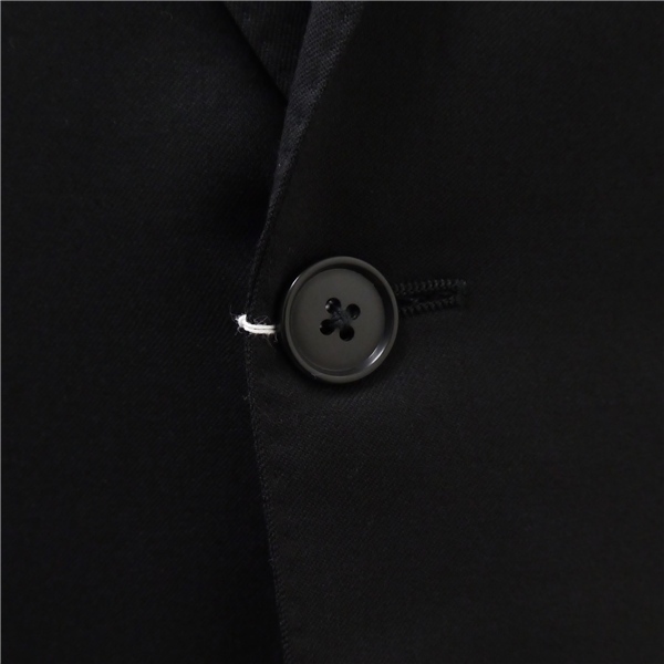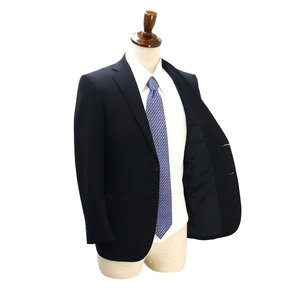・春秋対応。2つボタンシングル。総裏地仕上げ。センターベント。フラップポケット。ネーム刺繍なし。開き見せ。