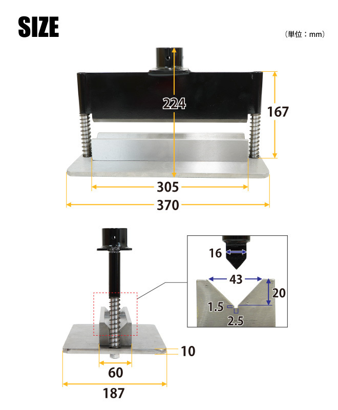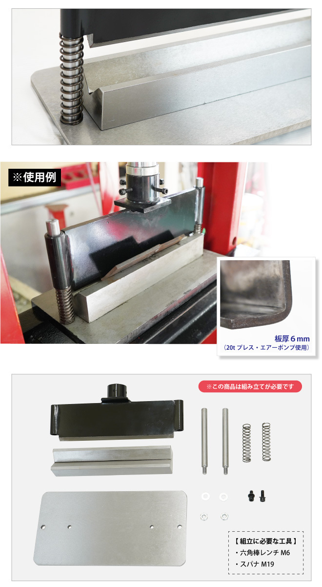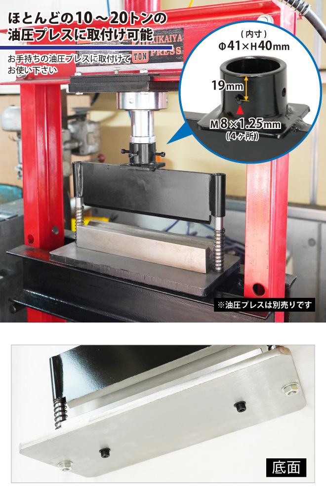 ●お手持ちの10~20tの油圧プレスに取り付けてお使い下さい ※プレス機とアタッチメントを固定するM8ネジは付属しておりません ●本品は組み立てが必要な商品です(必要工具:六角棒レンチ M6、スパナ M19) ※組立方法は付属の取扱説明書にてご確認ください ●油圧プレス本体は別売りです | ||||||||||||||||||
