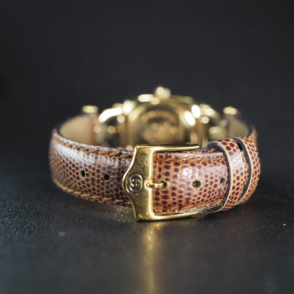 ◆1円~◆ GUCCI グッチ 6300L ホースビット GP/革 QZ 電池交換済み ゴールドカラー 箱 保 レディース 腕時計 「27803」