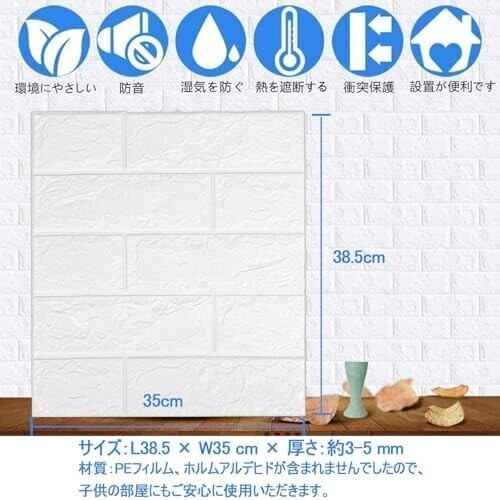 • 【製品仕様】3D壁紙レンガの20枚セットです。サイズ:縦38.5cm×幅35cm/枚。厚み:約0.3-0.45cm(凸凹により厚さが異なりますが、人工測定のため、実際数値は表記数値と若干差異がございます)。面積は0.13475㎡/枚、2.695㎡/20枚。素材:安全なPEフォームを採用しており、ホルムアルデヒドが含まれませんでしたので、子供の部屋にもご安心に使用いただきます。