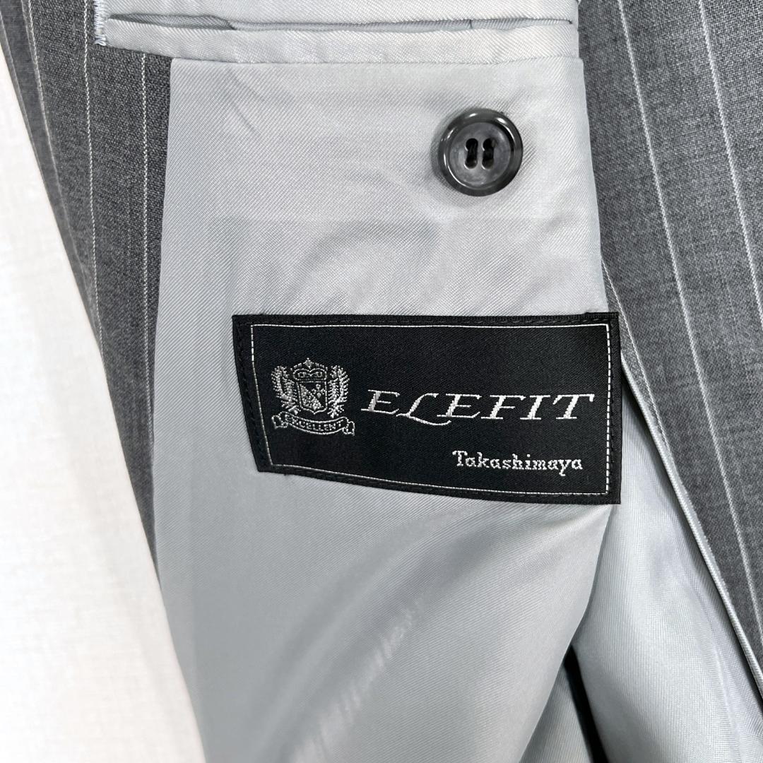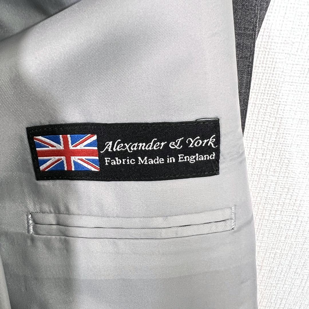 男性用 紳士用のグレー系のストライプスーツ(ジャケット・ベスト・パンツ) ビジネススーツです。中古品ですが目立つ傷や汚れもなく、まだまだ使えます。内ポケットにネームが入っています。古着 タカシマヤ Alexander & York Fabric Made in England ELEFIT Takashimaya
