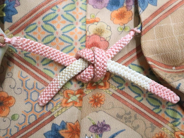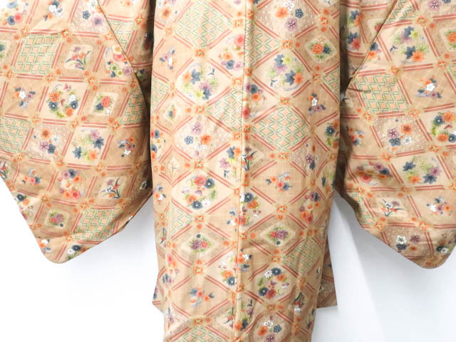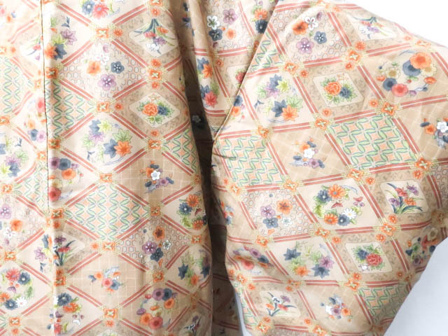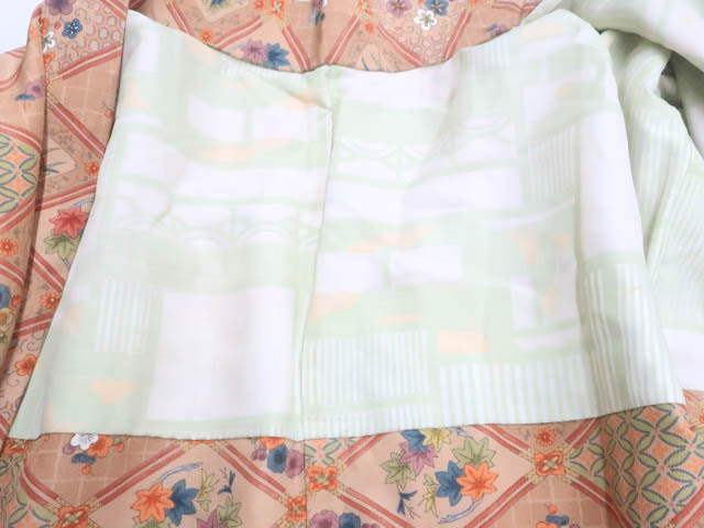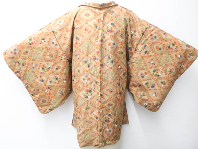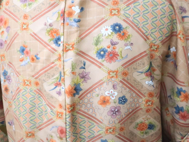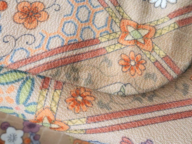 リサイクル商品のため、全体所々にしみ汚れがございますが着用可能なお品です。 地色は 薄茶です。 1枚目の画像が近いお色かと思われます。 素材は正絹です。 |