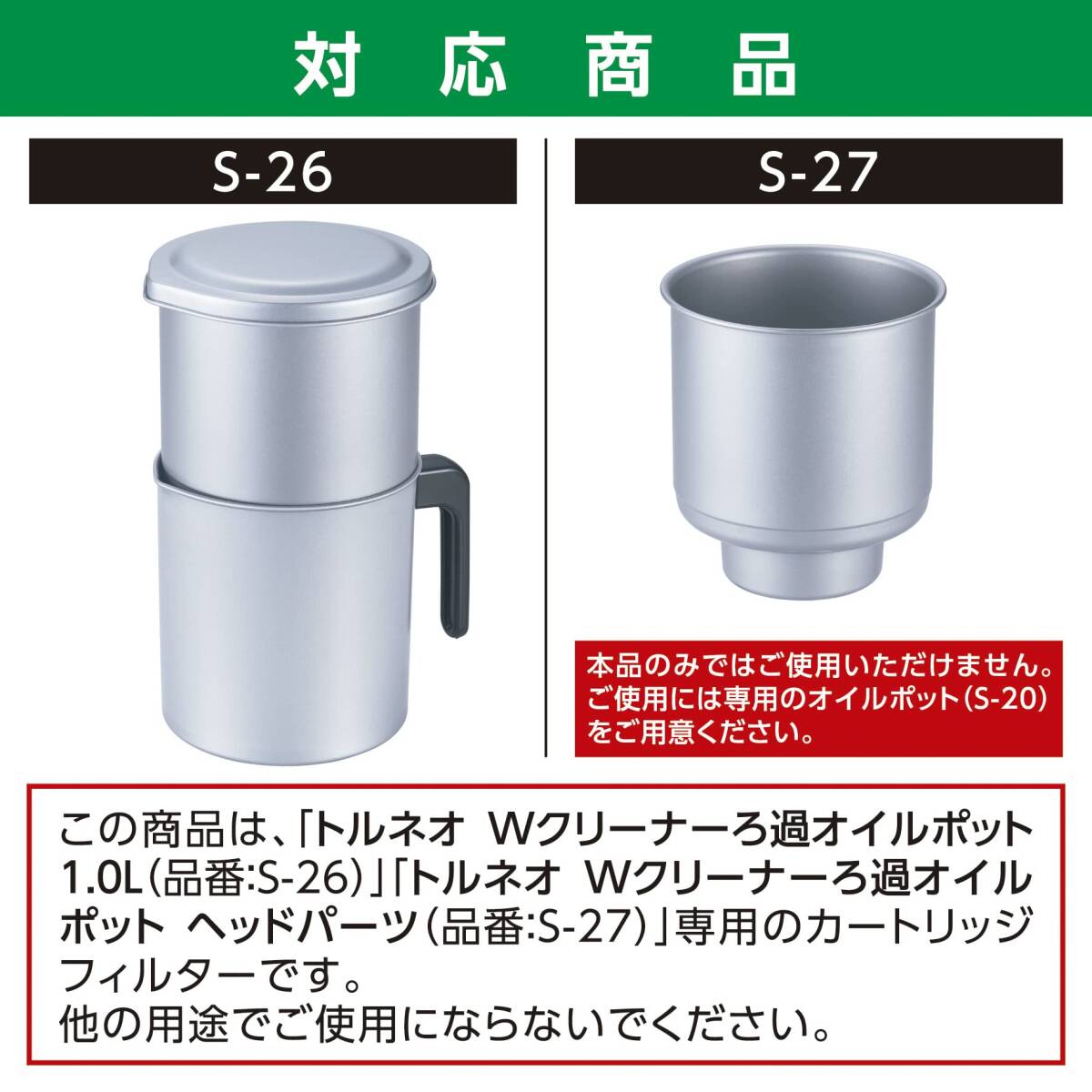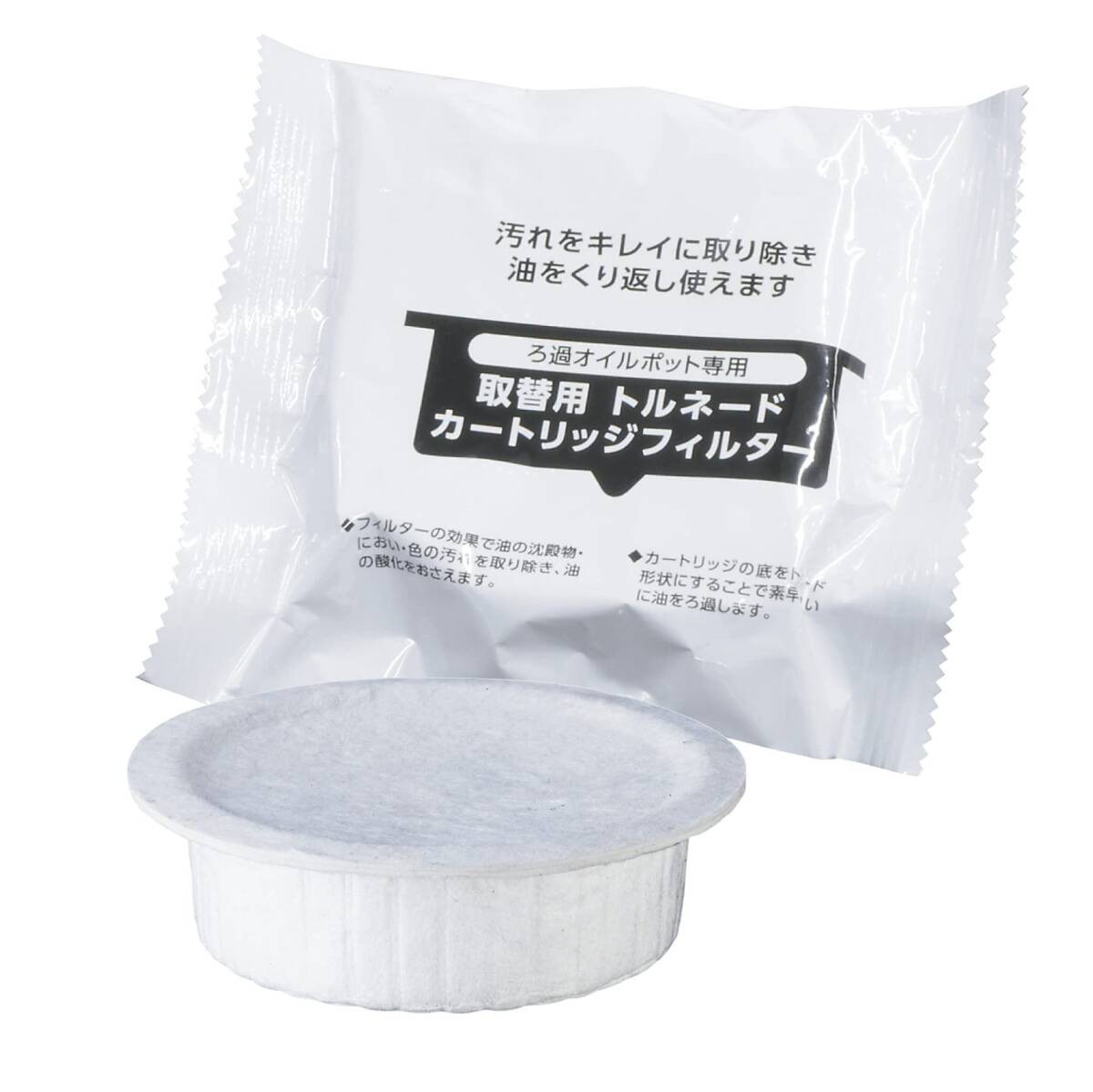 説明 ◆トルネオ Wクリーナーろ過オイルポット1.0L(品番:S-26)専用の取り替え用カートリッジフィルター ◆油のにおい・汚れ・酸化を抑えて繰り返し使えます ◆取り替え用カートリッジ1つで4リットル分(目安)くり返し使えて経済的 ◆カートリッジの底をトルネード形状にすることで素早くきれいに油をろ過します ◆使用後のフィルターはそのまま燃えるゴミとして処分できます