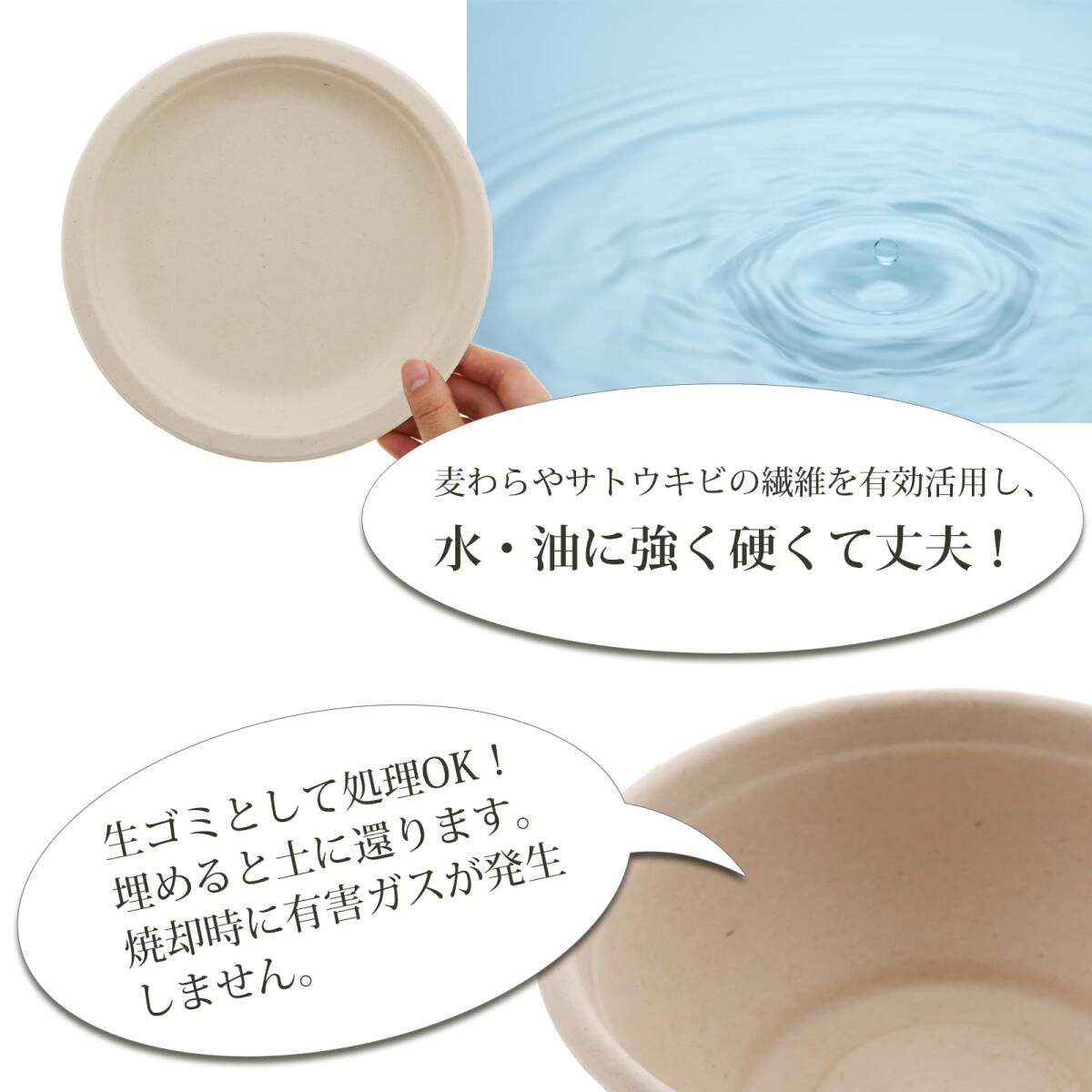 説明 ●大人数でのアウトドアシーンやおうちでの焼き肉におすすめ!耐水・耐油のペーパープレートです。 ●麦わらやサトウキビ繊維で作られているため、生ゴミとして処理OK!土に埋めると土に還る環境にやさしいエコ商品です。 ●しっかりとした丈夫なつくり&耐水なので、タレやドレッシング、汁気のあるおかずやデザートにも使えます。 ●電子レンジの使用が可能なので、温めなおせば温かい状態で召し上がれます。 ●使い捨てタイプは、ご家庭での食器洗いが億劫な日にあると洗いものが省けて助かります。 ●ナチュラルカラーがおしゃれなプレートは、お誕生日パーティーやピクニックなどにも活躍します。 ●停電や水が使えない地震などの災害時に、非常食を食べる容器としても役立ちます。 ●運動会やバザーなどの学校行事、自治会行事、マルシェなど飲食店のイベント、業務用使いにも最適です。 ※原料の特性により素材の繊維が見え、多少色ムラのある場合があります。色は素材そのままの色です。 【ご注意】 ※食品用の簡易食器としてご使用ください。 ※電子レンジでのご使用時には過熱による変形、食品からの水分や汁が浸透する場合があります。 ※本品はオーブンやオーブントースターではご使用になれません。 ※火のそばには置かないで下さい。 ※食品の長期保存用にはご使用しないで下さい。 ※熱湯は入れないでください。