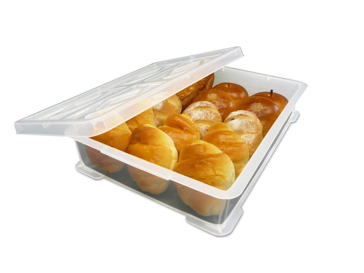 餅・パン・ケーキ・麺類などの一時保存や運搬に便利な平型フードコンテナ。 小型のパンや小餅、製麺に適した浅型タイプ。 蓋をしたままでの積み重ねが可能なので運搬に便利。