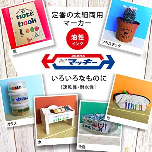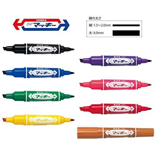 1本で太細両用が使える便利な油性インクマーカー。 黒・青・赤・緑・黄・ピンク・紫・茶の8色セット。 速乾性・耐水性で、紙・布・木・ダンボール・ガラス・プラスチック・金属・ビニール類などに幅広く利用できる。(浮輪等の軟質塩化ビニール製品には適しません。)