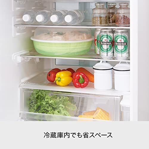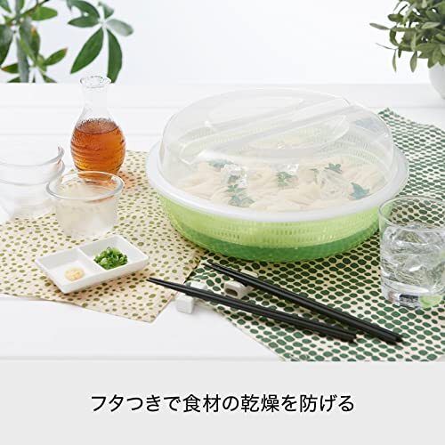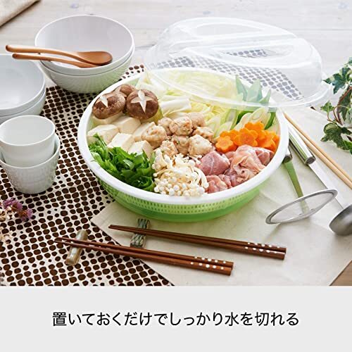 野菜などを水切りしたまま置いておけるフタ付きの水切り。 野菜を一気にザザッと洗える大きめのざる付き。容器にセットしてしっかり水切り。フタをしてそのまま冷蔵庫で一時保管もOK。 フタには菜箸やお玉などが置けるようになっているので鍋物など、卓上での使用に便利。 鍋物や素麺などのほか、バーベキューなど屋外のイベントにも。