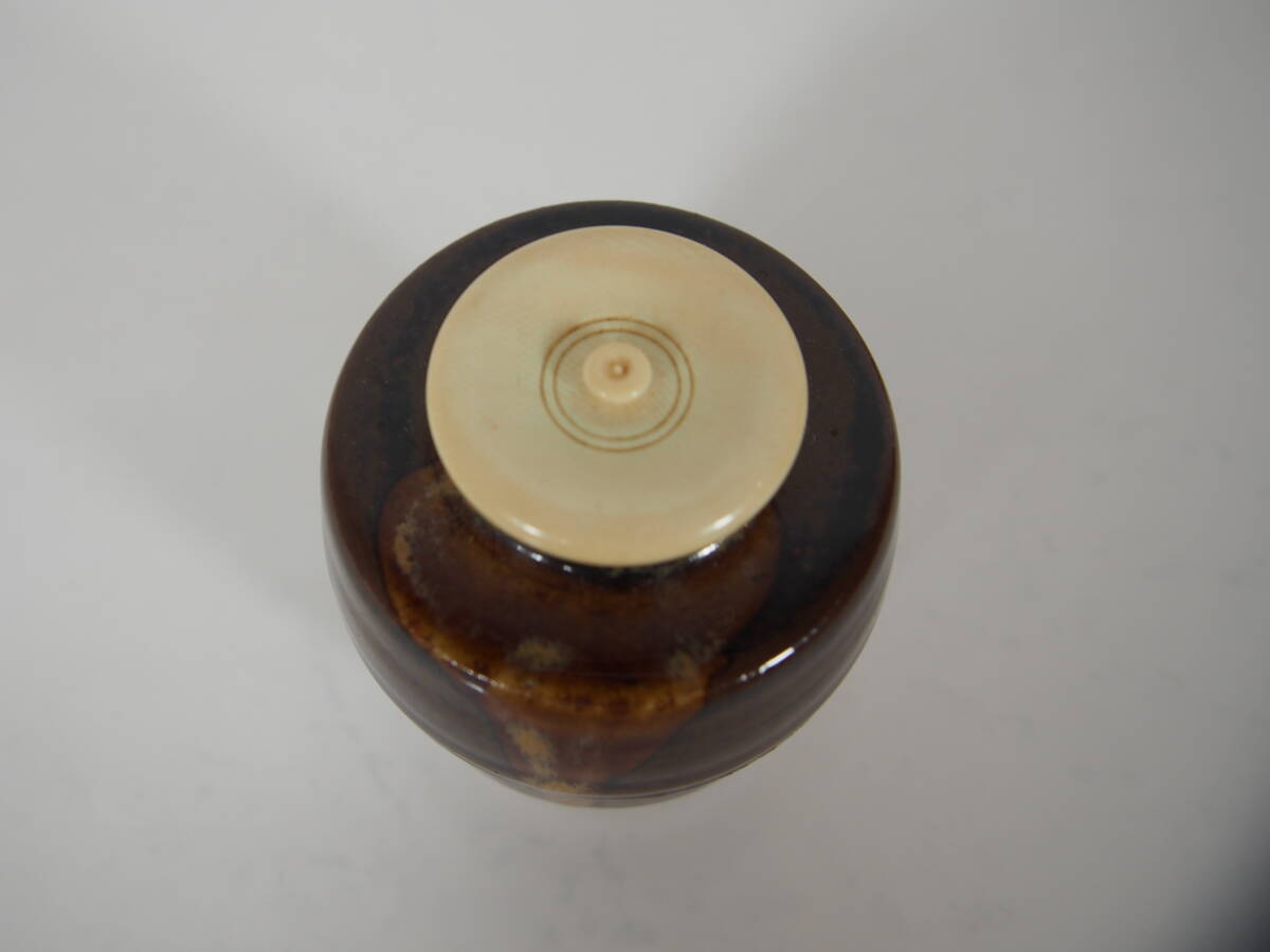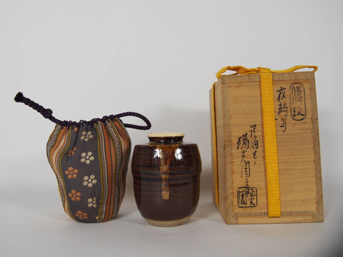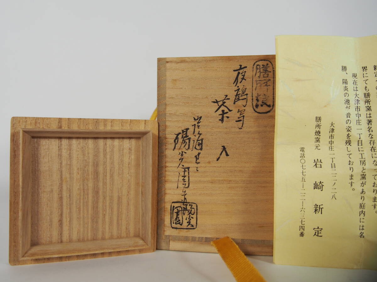 淡海ぜぜ 岩崎新定 陽炎園 膳所焼 夜鶴写 茶入 在銘 ぜぜ 仕服付 薩摩間道 共箱 茶道具 N-112