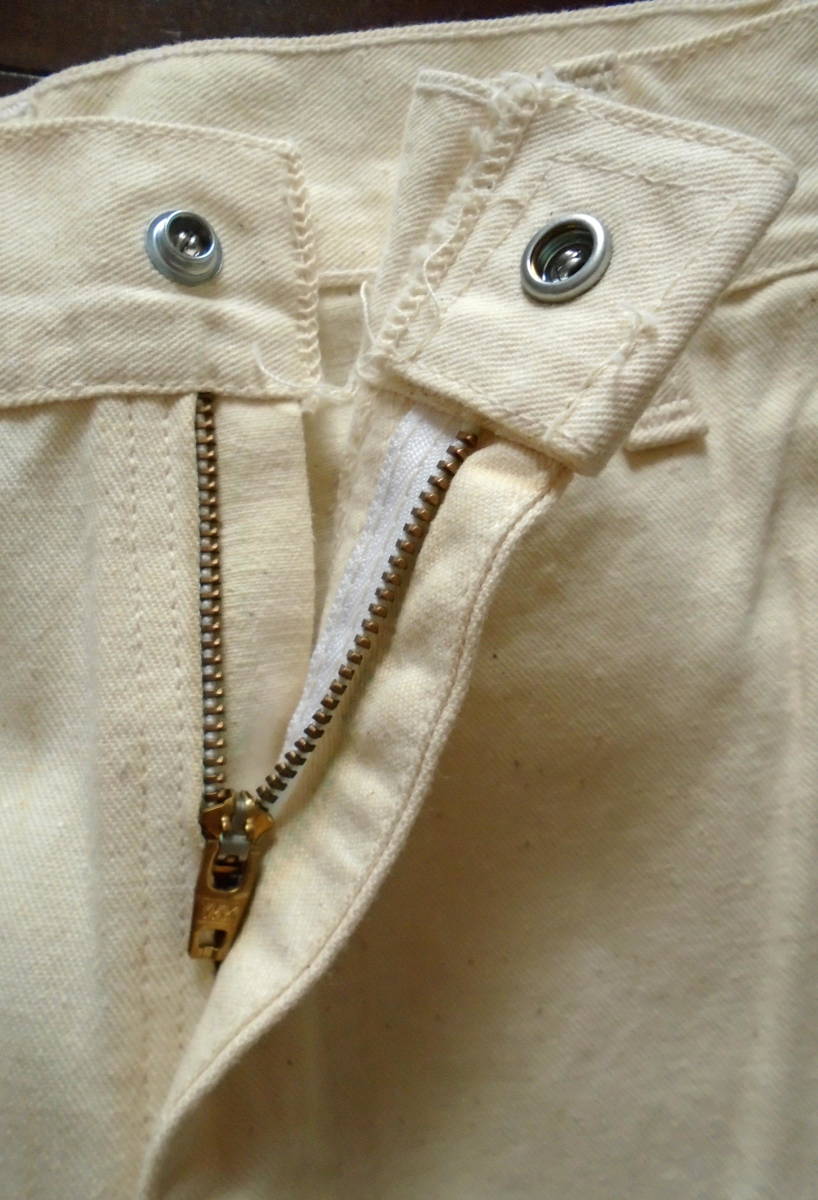 表記サイズは W:40 L:30。 実寸で ウエスト 約96cm程 股下 約76cm程 あります ( W:38 / L:30程 ) 1980年前後のシアーズ。 右後ろウエスト部分にユニオンチケット。 トップはスナップ留め。 YKKジッパー。 バックにハンマーループ。 生成り白・オフホワイト色。 やや軽めのOZのコットン100% 生地。 未着用新品です。 希少品。 米国製。 | |||
