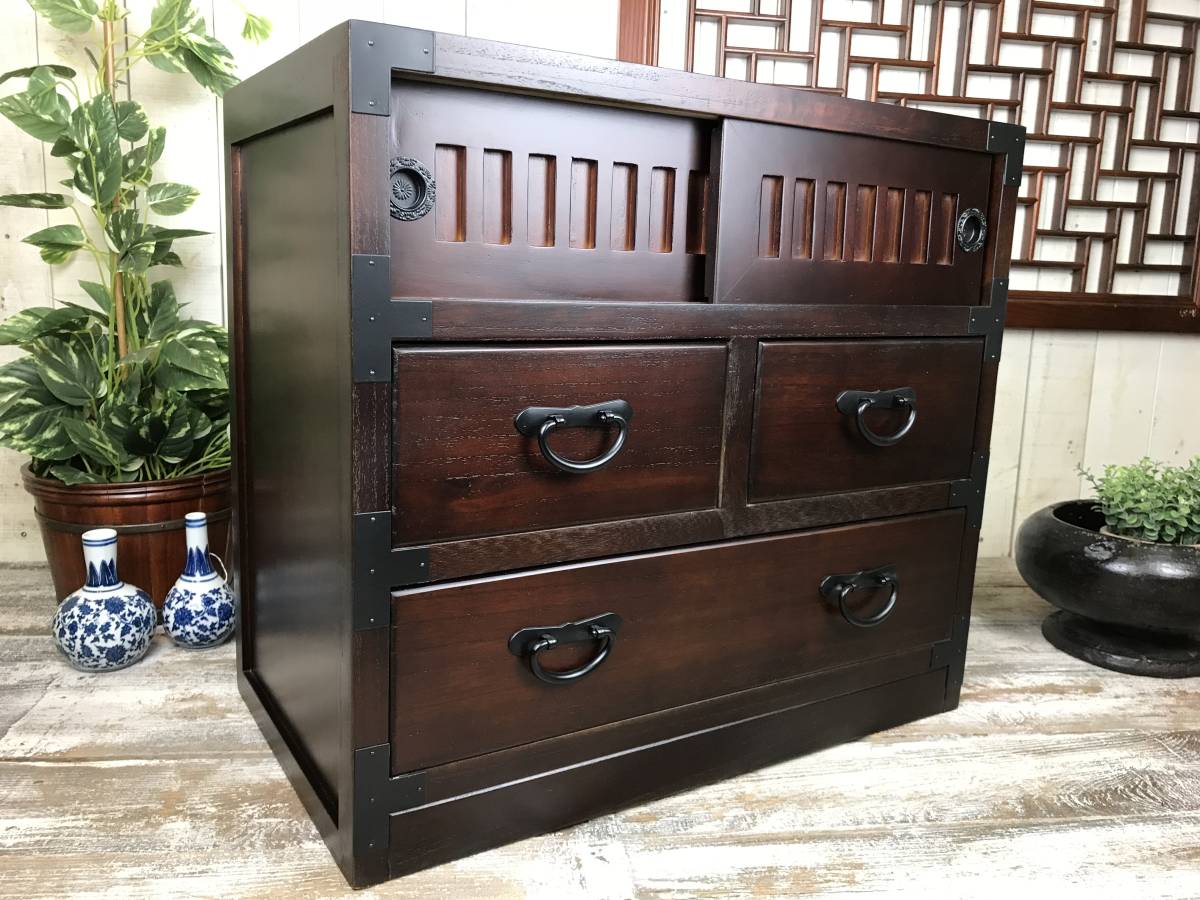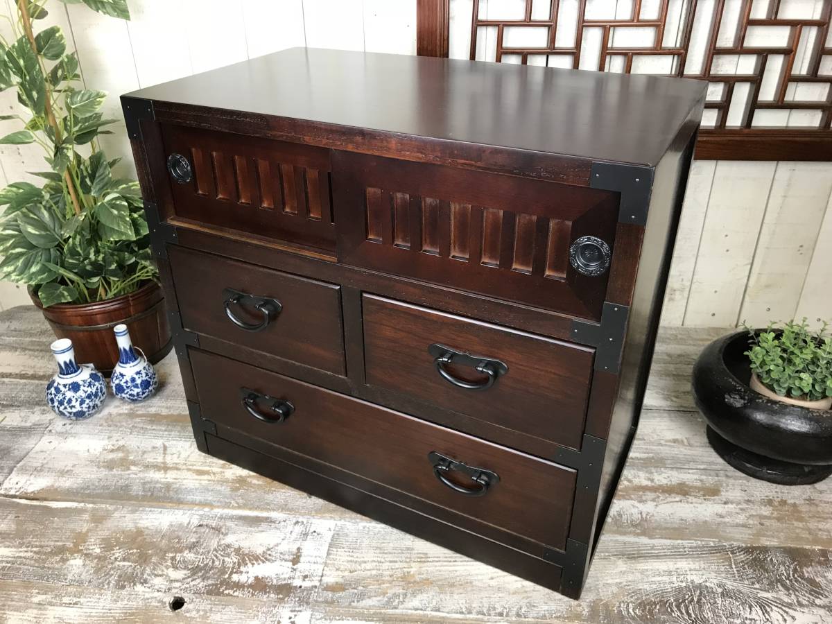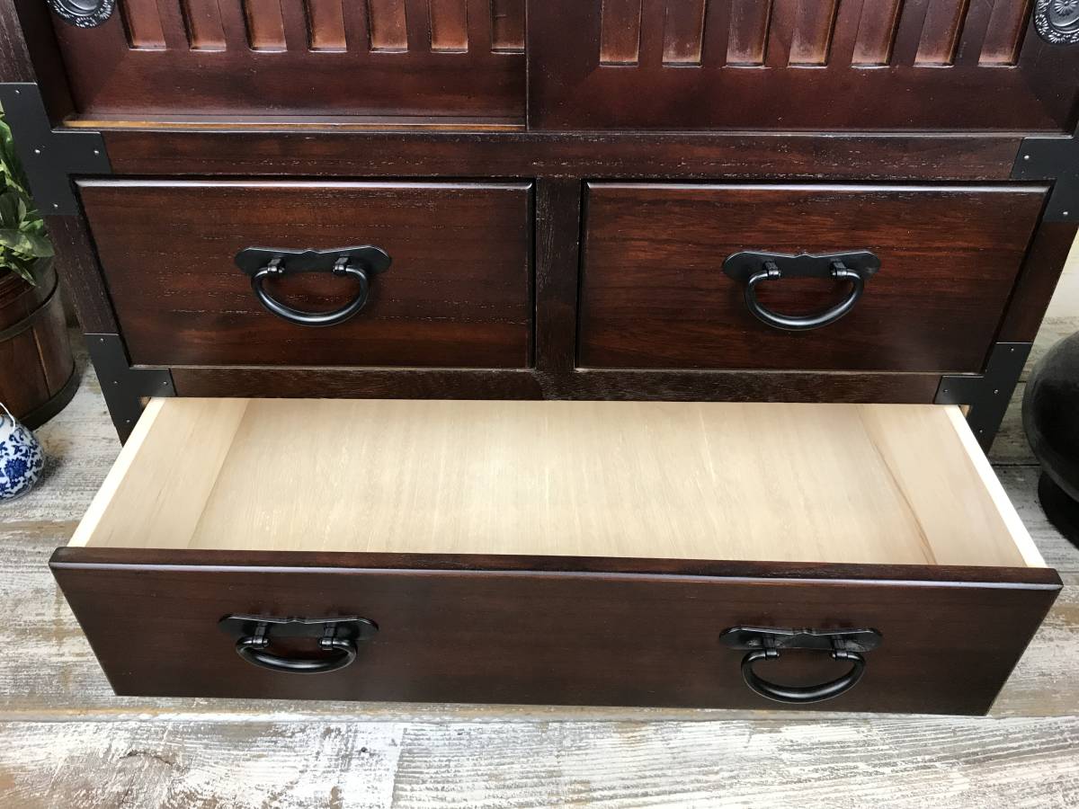 ■商品詳細■ 民芸家具和タンス 民芸調の落ち着きのある素敵な和箪笥です。どこか懐かしい和の温かみがあるお品。材質は桐材を使用しているため手触りが柔らかく、調湿性・耐火性・防虫性に優れています。変形などもなく長年愛用していただけます。桐材なので軽くて持ち運び、移動など楽々です。古き良き時代を思い出させるデザインで和室、アジアンインテリアにぴったりです。黒塗りの金具が高級感があり、お部屋に置くだけで存在感抜群!お色は飽きのこない濃い目のブラウンで重厚感を演出しています!人気商品が今だけこの価格!他では買えない民芸商品をぜひこの機会に。 【商品状態説明】 美品。 完成品になります。 ・こちらの商品は、現品画像ではありません。未開封の在庫の中から丁寧に検品後、発送いたします。 【サイズ】 横幅:60㎝ 奥行:35㎝ 高さ:54㎝ 引き出し内寸小:24cm×31cm×11cm 引き出し内寸大:51cm×31cm×11cm 引き戸内寸:55cm×31cm×13cm 【素材】 桐材 【カラー】 ブラウン 【参考価格】 ¥19,000 | ◆◇発送方法◇◆ ●送料は基本無料ですが、沖縄・離島などにお住まいの方はご負担ください。 (沖縄・離島の方はメールにてご連絡いただければ、送料をお知らせいたします。) ●ヤマト運輸・佐川急便・第一貨物のいずれかにて配送いたします。 (運送会社の指定はできません。ご了承ください。) ●日時・時間指定のある方や、お問い合わせ(追跡)番号をご希望の方は取引連絡の際にお知らせください。 | |