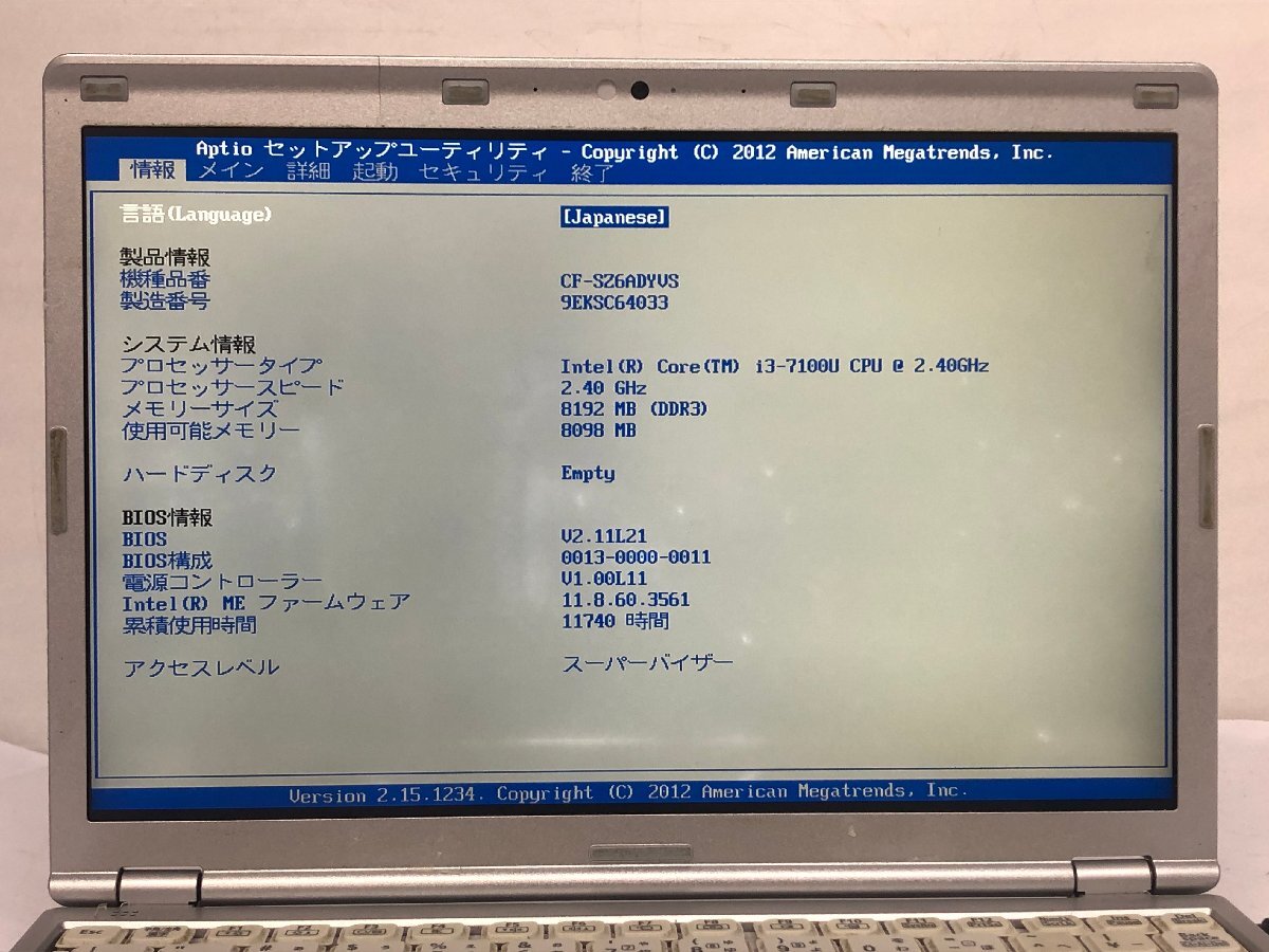 ジャンク/ Panasonic CF-SZ6ADYVS Intel Core i3-7100U メモリ8.19GB ストレージ無し 【K22712】