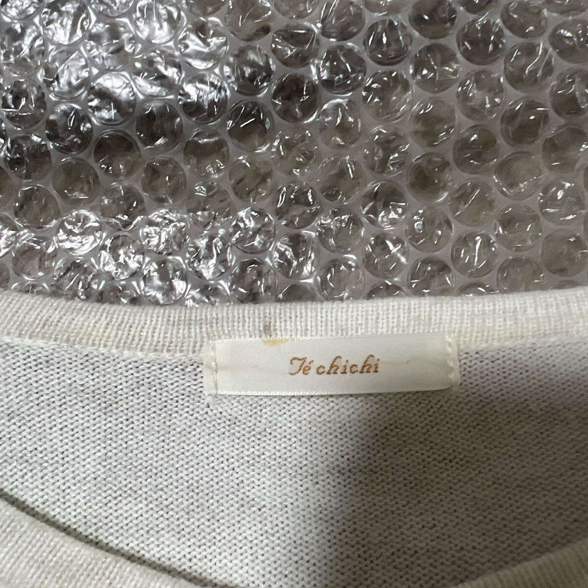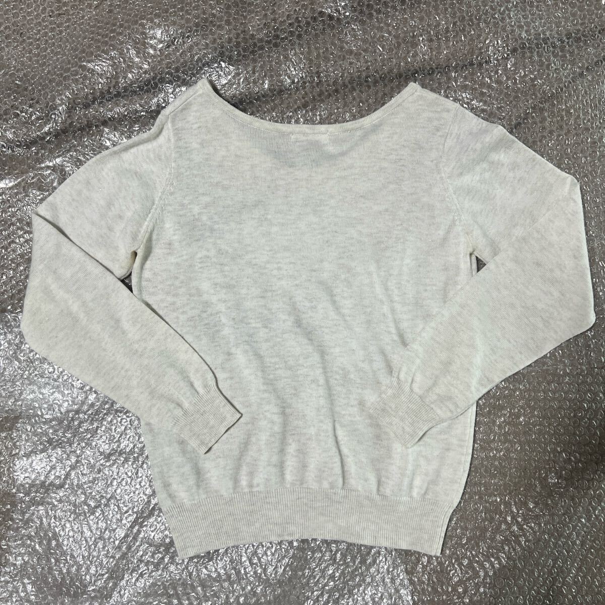 ライトグレーよりのお色のVネック長袖ニット、柔らかい素材感が魅力。