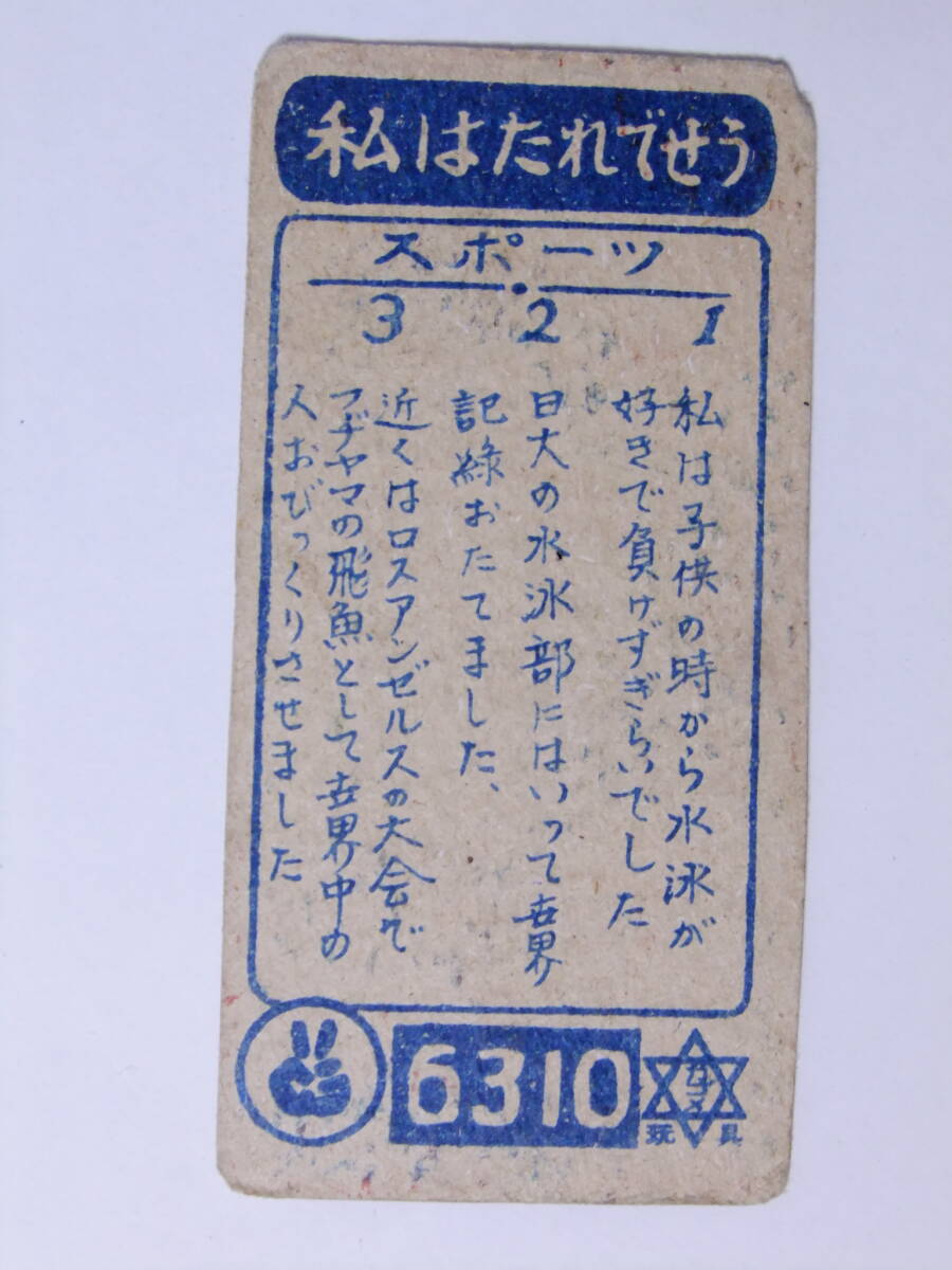 メンコ 昭和20年代 水泳 古橋廣之進 フジヤマのトビウオ 浜松 めんこ カード ビンテージ 面子 おもちゃ 玩具 昭和レトロ 当時物です。