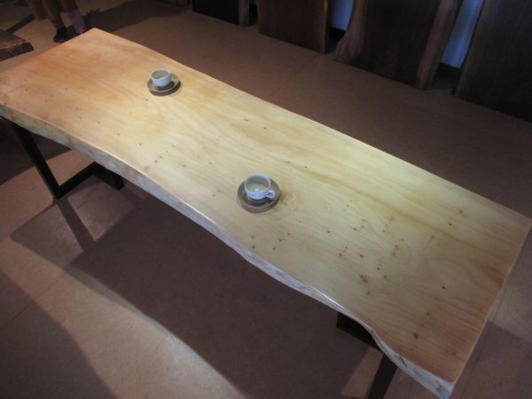銀杏の一枚板無垢のテーブルです。ジャンボサイズで、豪華です。画像のように、、木目も色合いもとてもきれいでです。厚みも幅も充実しており、ずっしりして、高級感と存在感があります。これから最終仕上げに入ります。よりきれいになります。