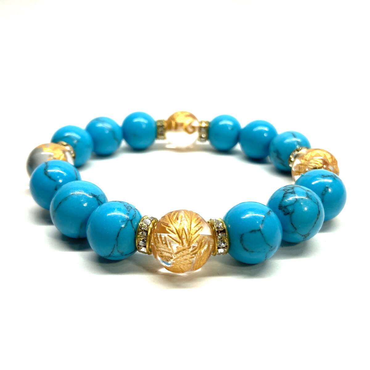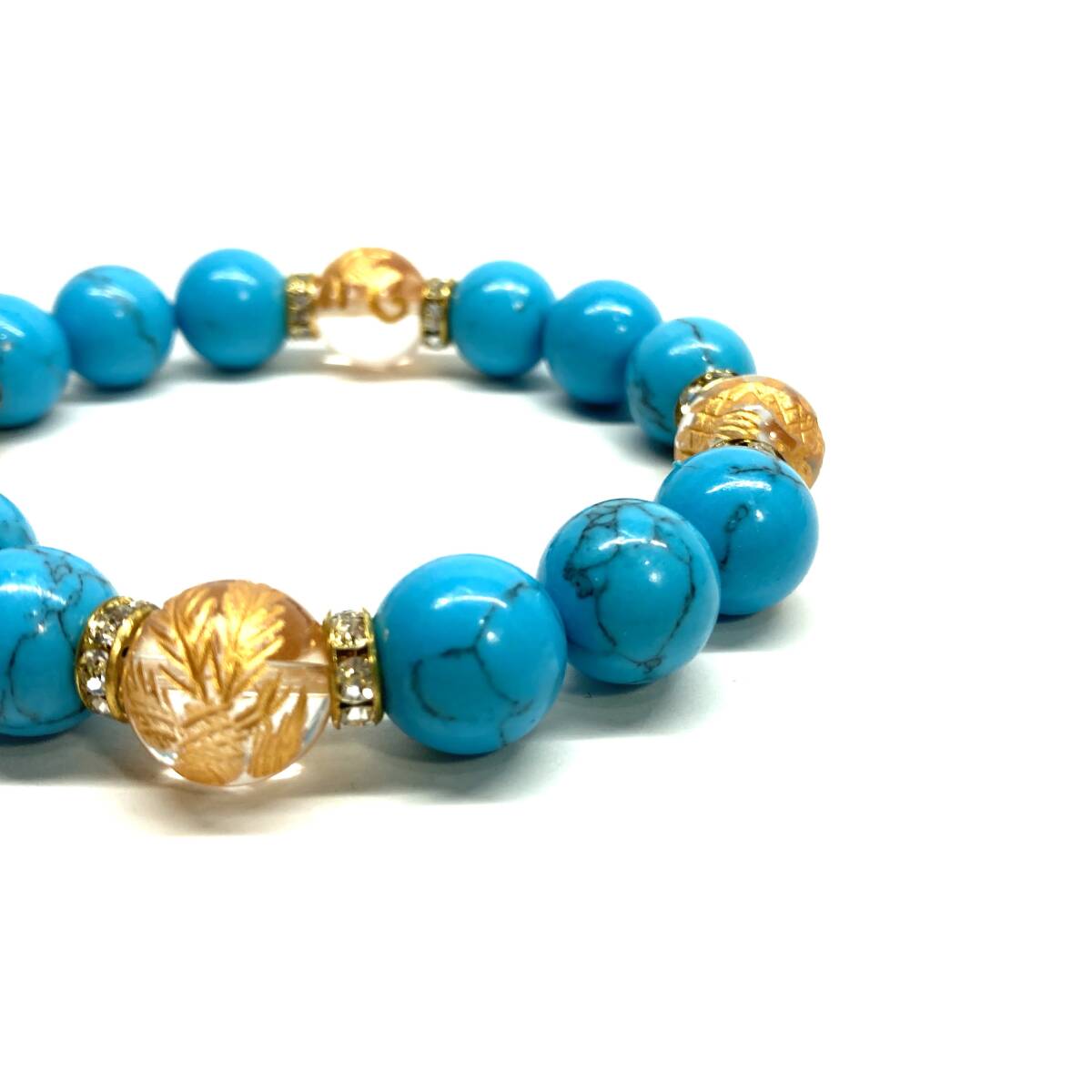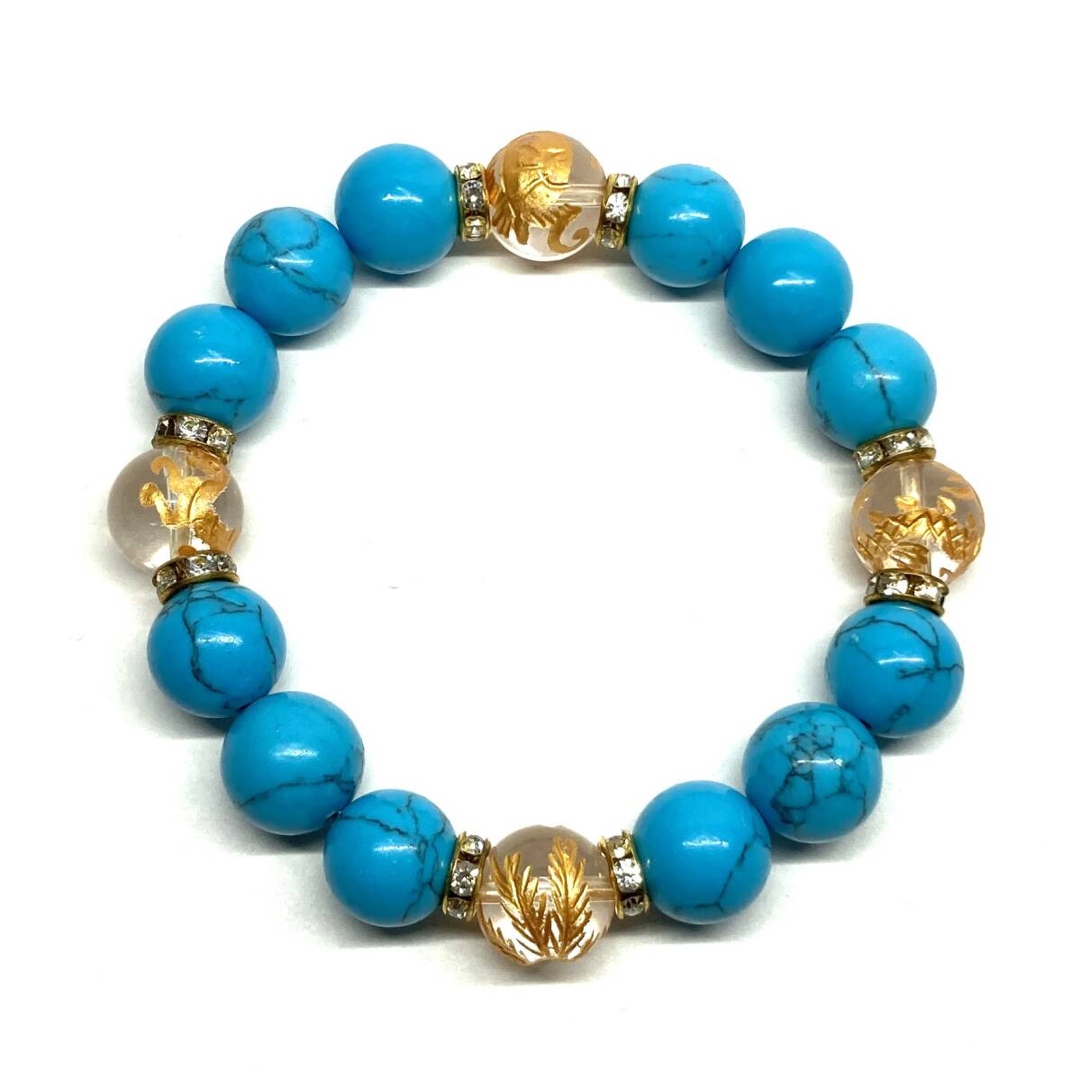 四神獣金彫水晶×ターコイズ 12mm パワーストーン ブレスレット青龍 白虎 玄武 朱雀 運気上昇 お守り 金運 健康運 四神獸 四神相応 G #1