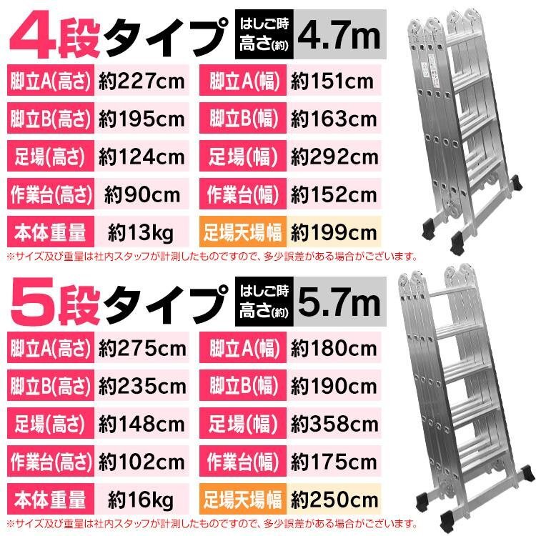 工事現場のプロも絶賛!! 多機能アルミ製はしごです。 多機能アルミ製はしごはこんな時に大活躍!! 植木のお手入れ、窓ふき、お掃除、工事、洗車、作業台など・・・ 組み方次第で様々なシーンに活用できる! 耐荷重100kgでとっても丈夫! ワンタッチ式ロック&調整付き! 安全・安心の横倒れ防止付き! アルミ製なので軽量、しかも小さく折り畳めるので車や倉庫に積みこみやすいです。 【商品仕様】 サイズ(約): ・折り畳み時:幅 38cm×奥行き 28cm×高さ 103cm ・ハシゴ時:高さ 370cm ・脚立時:高さ 180cm ・足場時:幅 230cm 高さ 100cm 材質:アルミニウム、スチール 重量(約):12kg 耐荷重(約):150kg ステップ数:3段×4 (多目的はしご 折り畳み アルミ 安い 送料無料) ※大型商品のため、特別中継料が適用されます。(北海道+1.100円/沖縄本島+2.200円/離島+2.200円) |
