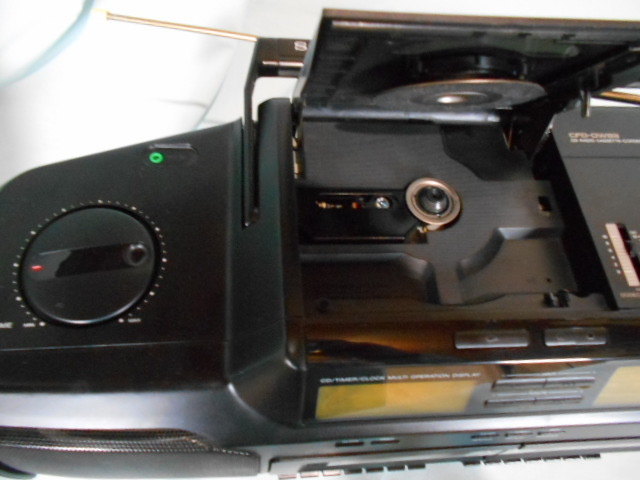 本機はCD/ラジオ/カセット の各再生が出来ます。 背面にCD OUT/ LINE IN の装備があります。 カセットユニットはA/B のダブルカセットとなります。 両カセット部再生不可の為、中品ベルトと交換しました。 A : 再生専用 1ヘッド、オートリバース機構です。 B : 録/再 2ヘッド、オートリバース機構付です。 ノイズリダクションの装備はありません。 キャプスタン軸、磁気ヘッド 及び、ピンチローラーは 市販クリーナー液で清掃しました。 CD蓋及び、カセットホルダー開閉は機械式です。 FM ワイドバンド対応機です。 ロッドアンテナに折れやヘコミはありません。 CD ユニット部の制御基板のコンデンサー2個を交換しました又、 CD ユニットをベースに取付部のゴム製ブーツ痩せの為、 ゴム製スペーサーを敷いた上にゴムブーツを置いてネジ止めしました。 時計用電池ターミナルコイル形状側にサビ発生が ありましたので簡易除去しましたが、完全には除去 出来ていません。 CD ユニット、カセットユニット及び、スピーカー 3個 を 取外し内部簡単に清掃しました。 正面及び、背面内部の低音用スピーカーのエッジや センターキャップ、振動部に変形や破損はありませんでした。 本機の表示は液晶を使用ですが、バックライトは入っていません。 本体に小キズありますが、大きなキズはありません。