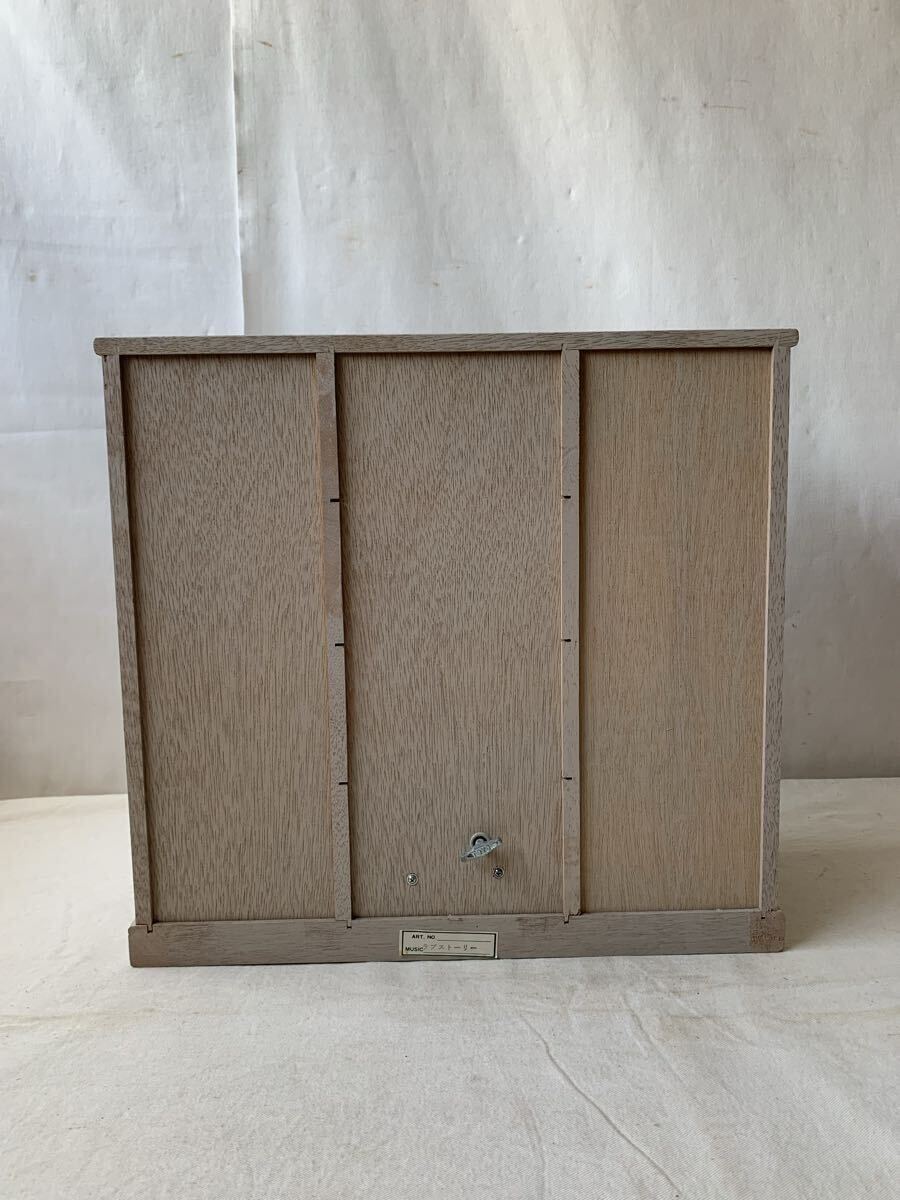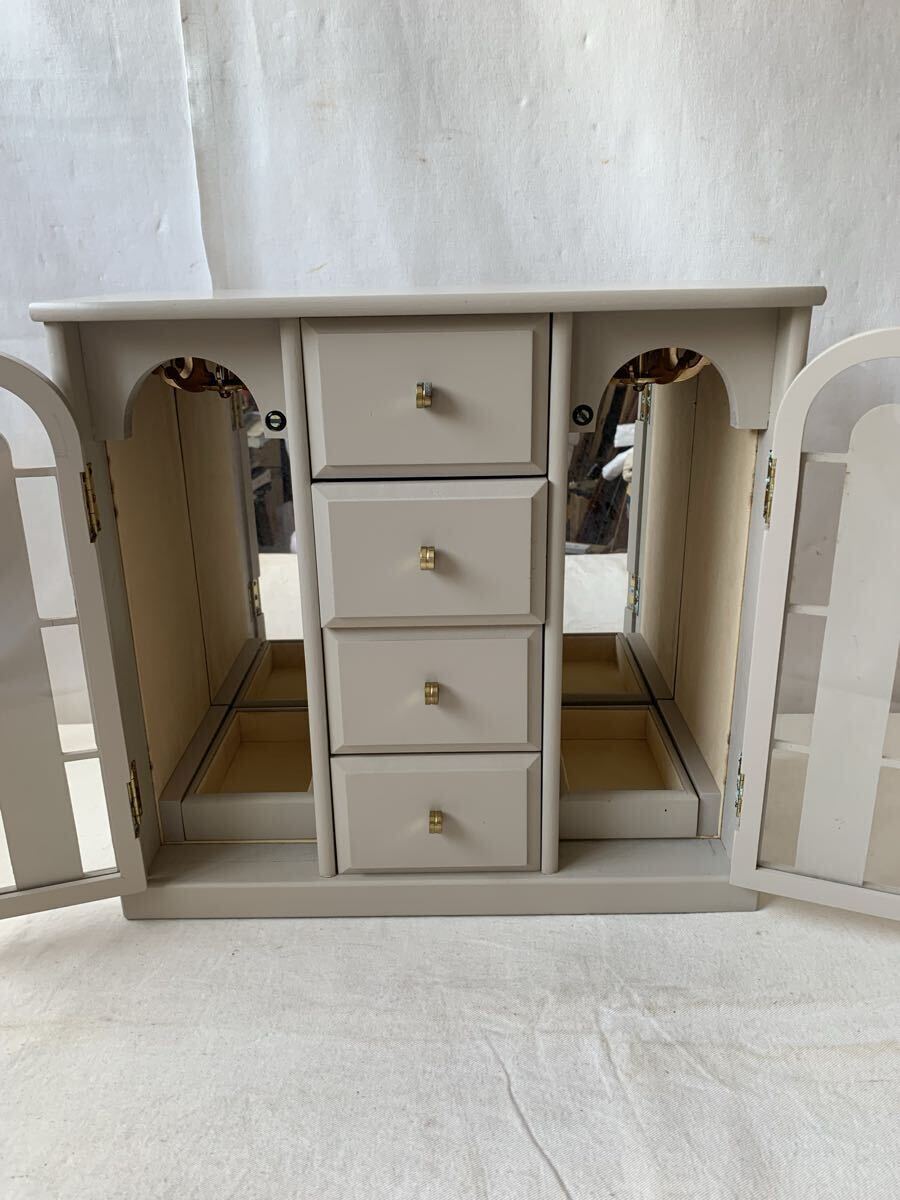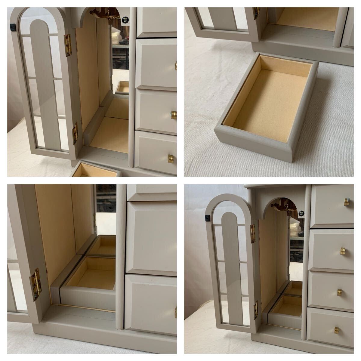 デッドストック品 デザインが素敵な木製ジュエリーボックスです。収納がたくさん付いており、小物やアクセサリーなどを収納するお部屋のインテリアやお店のディスプレイ、イベント出店時の什器などに使って頂くと素敵だと思います。オルゴールは機能しておりません。